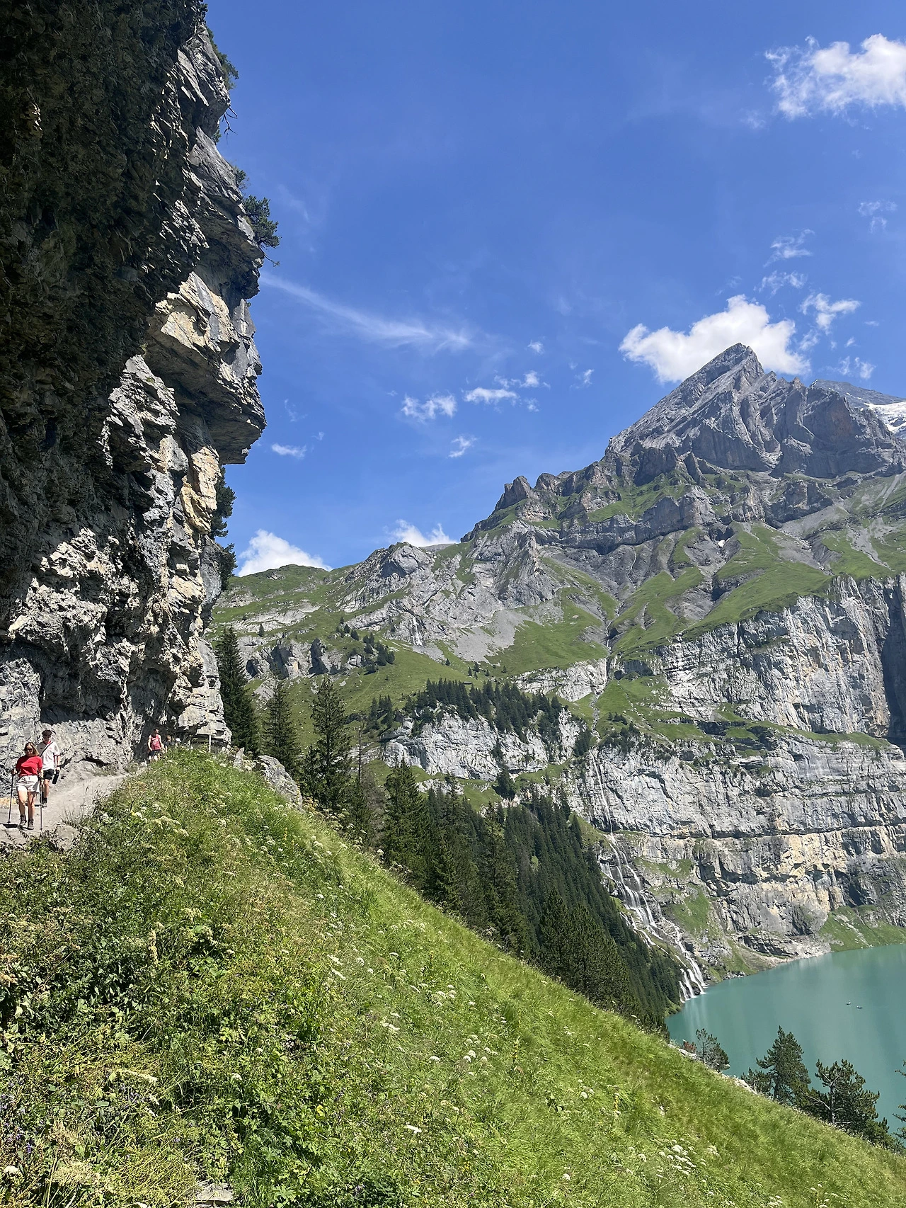 외슈넨제를 더 다양한 각도에서 감상하기 위해 등산길에 올랐다. 길이 조금 험할 수 있다고 라라가 경고했었는데, 조금 험한 정도가 아니고 그냥 여기서 자칫하면 미끄러져 죽을 수도 있겠다는 생각이 들 정도로 아슬아슬한 보폭의 길이 이어졌다. 알프스 산을 몇 차례 타보면서 깨달은 바가 있다면, 등산객 스스로가 위험에 대한 준비성과 책임감을 확실히 갖고 있어야 한다는 점이다. 등산객의 안전과 편의성이 최우선으로 고려된 우리나라의 산행로와는 달리 스위스의 산행로는 자연 그대로를 최대한 존중하는 형태로 설계되어 있다. 때문에 난간, 계단 같은 인공적인 구조물은 정말 위험한 구간에만 최소한으로 설치되어 있고, 대부분 야생 상태의 자갈길, 흙길, 바위길이 안전장치 없이 쭉 이어진다. 어떨 때는 이 등산로마저 명확히 보이지 않아 앞사람과 등산스틱에 의존해 길을 찾아야 하는 경우도 있다. 나 또한 처음에는 이런 상황을 겪고 무척 당황했지만, 한편으론 나와 자연 사이의 경계가 흐려지면서 내가 자연에 온전히 동화되는 물아일체(物我一體)의 경지를 경험하며 강렬한 전율을 느끼기도 했다. 외슈넨제의 산행로에서 역시, 좁게 난 길 옆으로 나를 집어삼킬듯한 거대한 자연으로부터 엄청난 에너지를 느끼며 한 걸음씩 나아갔다.