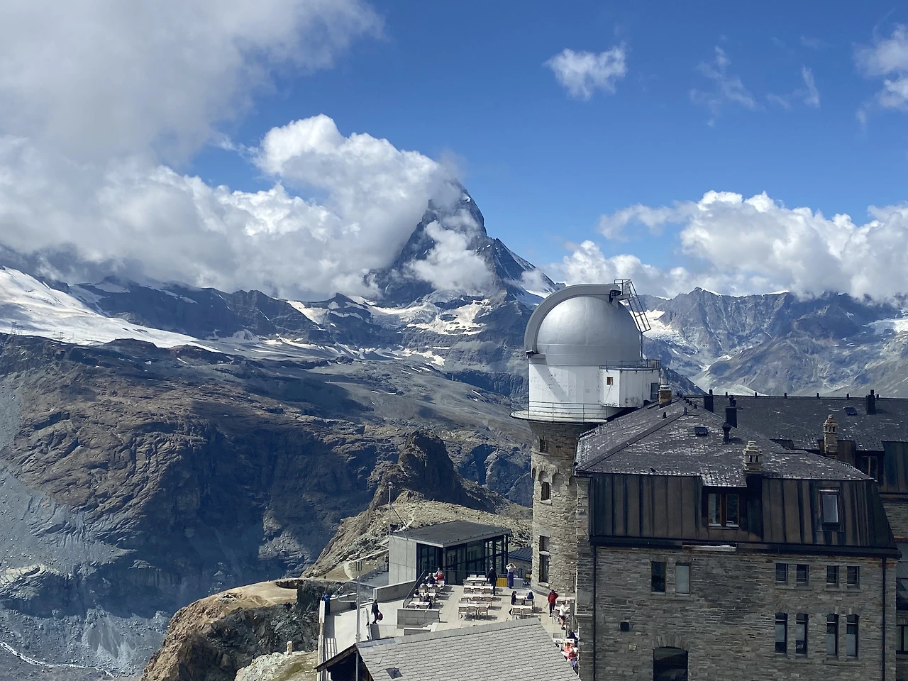 해발 3,000 미터의 고도 위에서 조금은 더뎌진 발걸음과 가뿐 숨을 몰아쉬며, 한결 가까워진 고르너그라트 전망대를 향해 천천히 올라갔다. 무거워지는 다리와는 반대로 가벼워지는 마음. 경사로가 끝날 때까지 하염없이 걷다 보니, 마침내 정상을 알리는 표지와 함께 마테호른과 병풍처럼 주변을 둘러싼 다른 알프스 봉우리들이 우리를 반겨줬다. 전망대 난간에 기대어 산맥의 결을 따라 시선을 옮기다, 대각선 위로 길게 뻗은 빙하와 조그맣게 보이는 오두막집에 시선이 고정되었다. '설마 저런 곳에 사람이 살 리가' 하고 빤히 보고 있으니 수지가 웃으며 설명해 준다.