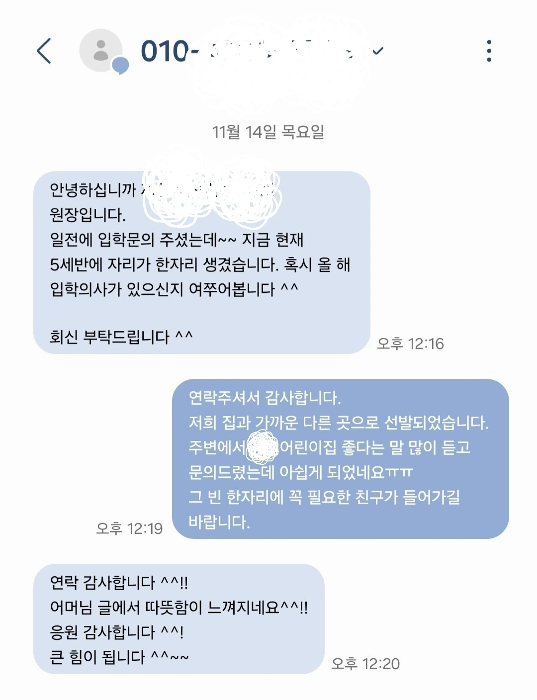 간단히 답장할 수도 있었지만 왠지 그런 마음이 들었다. 내 아이의 입학을 앞두고 고민이 많은 엄마들만큼이나 한 아이를 자신의 기관으로 맞이하고픈 원장님, 선생님들의 마음도 고민이 많지 않을까. 단순히 경쟁? 비교? 이런 것들로 바라보기보다 응원하면 좋겠다는 작은 마음.