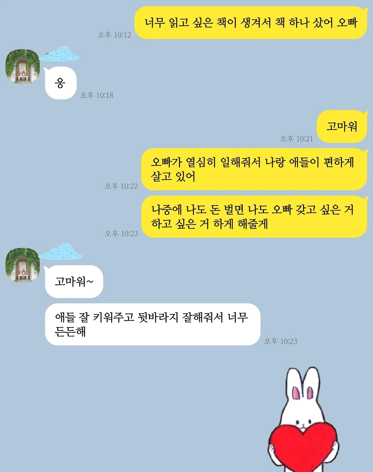 같은 시간 남편은 당직 근무 중이다. 남편이 일하고 내가 육아하는 것. 당연한 것이 아니다. 남편이 일하지 않으면 난 지금 이렇게 앉아있을 수 없다. 내가 아이들을 위해 희생하는 것만큼 남편도 가장으로써 많은 것을 희생하며 살고 있다. 다른 장소에서 다른 모습으로 살아가는 것 같지만 남편과 나는 부부가 되었기 때문에 같은 마음으로 같은 삶을 사는 것이다. 그래서 사랑은 너의 마음과 나의 마음이 하나가 될 때 빛을 발한다. 모든 것이 나와 다른 사람과 어떻게 하나가 될 수 있는가. 사랑할 때 가능하다. 사랑은 오래 참고 믿고 모든 것을 견디는 것이란다. 억지로 하면 끝까지 갈 수 없는데 내가 받은 사랑이 내 안에 가득 찰 때 나는 그것을 떠서 부어줄 수밖에 없다.