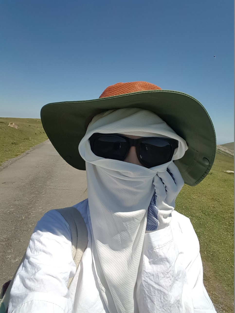 아스팔트길로 이어진 끝없는 오르막길을 지나, 걷고, 걷고, 또 걷다 보니 어느새 예쁜 산들이 발아래에 위치해있었다. 탁 트인 전망에 감탄하는 것도 잠시, 오늘의 긴 여정이 생각나 걸음을 재촉했다. 이때쯤부터 같이 출발한 언니와 속도 차이가 나서 내가 먼저 앞서가게 되었다. 산행이 너무 힘들고 더워서 아무 곳에서나 주저앉아 물을 마셨고, 스포츠 타월에 물을 적셔 얼굴과 목에 감싸 더위를 식혔다. 구름 한 점 없는 맑은 날씨만 이어졌고, 허허벌판에 잠시 쉬어갈 그늘조차 없었다. 지금 내가 할 수 있고 해야 하는 일은 해가 더 강하게 내리쬐기 전에 빠르게 정상을 찍고 산을 내려가는 것뿐이다.