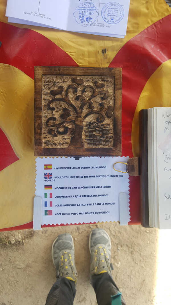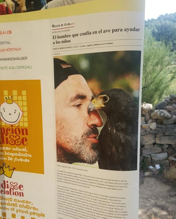 본격적으로 산을 오르기 전 작은 벤치와 천막이 있는 곳을 발견했다. 벤치 위에는 새 모형이 있고 독특한 의상을 입은 아저씨가 천막 안의 물품을 정리하고 있었다. 순례길에서 가끔 만나는 도나티보 아저씨인가 보다. 세요(sello, 도장)를 찍어주고 도나티보를 받는 행상인치고는 꽤나 의상이 독특하다 싶었는데 천막 옆에 있는 안내판을 보니 유명한 분인 것 같았다.