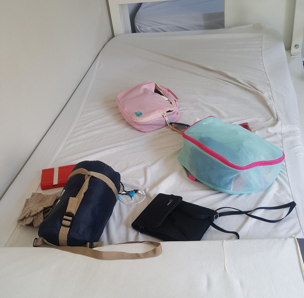 팔라스 데 레이(Palas de ray)에 도착했다. 침대를 배정받고, 배낭 안의 모든 짐을 풀어놓았다. 짐을 공개하는 건 처음인데, 좌측 사진에 있는 짐이 내가 가진 모든 짐이다. 입고 있는 옷과 신발, 스틱을 제외하곤 진짜 저게 전부다. 분홍색 파우치엔 옷이 들어있고 하늘색 파우치엔 세면도구와 각종 잡다한 물품들이 들어있다. 왼쪽 빨간색 물건은 블루투스 키보드이고, 그 밑의 갈색 물건은 발가락 양말이다. 그 옆에는 침낭이 있고 돈이 들어있는 보조가방이 바로 옆에 자리 잡고 있다.
