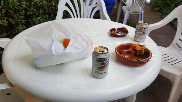 오늘 너무 긴 거리를 걸었고, 덥고 힘든 하루가 계속 이어졌기 때문에 저녁을 할 자신은 없었다. 작은 마트에서 맥주와 간식, 그리고 내일 아침 먹을거리를 간단히 사서 알베르게에 돌아왔다. 유로스도 그리 배가 고프지 않았던지 맥주와 간식을 샀고, 우리는 같은 테이블에 앉아 호스피탈레로가 준 과일을 나눠 먹었다. 하루를 정리하기 위한 각자의 시간을 서로 방해하지 않기 위해 우리에겐 암묵적인 규칙이 있었다. 그와의 따뜻한 침묵 속에서 나는 글을 썼고, 유로스는 담배를 피우며 하루를 마감했다.