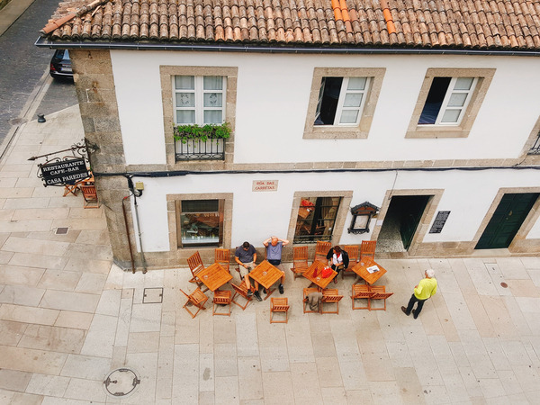 그래서 오늘과 내일은 일정이 없는 자유의 몸인데도 새벽같이 일어나서 걷게 되었다. 바로 이 식사권 때문이다. 산티아고에 도착하면 꼭 해야 할 일 중 하나가 바로 순례자 사무소에 들려 산티아고 완주 증명서를 받는 것이다. 산티아고 순례자 사무소가 어딨는지 인터넷에 검색하던 중 어떤 정보 하나가 눈에 들어왔다. 순례자 사무소에서 완주 증명서를 줄 때 매일 오전 선착순 10명에게 근처 레스토랑의 점심 식사권을 준다는 정보였다. 5시 30분 쯤 순례자 사무소에 도착하니 우리 외엔 아무도 없어서 제대로 찾아온 게 맞나 싶은 생각이 들었다. 점심을 맛있게 먹겠다는 강한 의지가 꼭두새벽에 사람을 일어나게 하다니…. 하지만 10여 분 정도 지나자 아무도 없던 길가에 서서히 사람들이 모여들었다. 한 외국인이 순례자 사무소 앞에 배낭을 내려놓고 앉았다. 그 외국인 바로 뒤에 줄을 섰다.