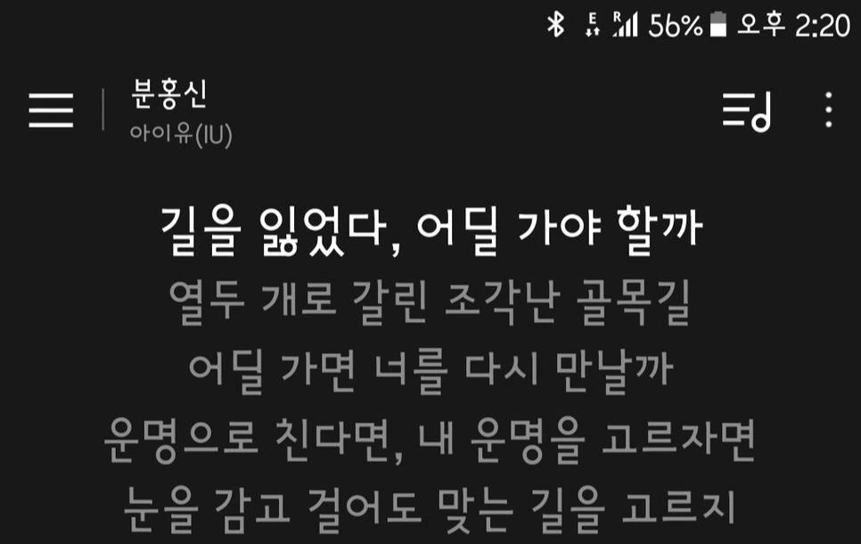 어제보다는 훨씬 가벼운 몸과 마음이었는데 이상하게 길을 자꾸 잃었다. 한 곡을 하루 종일 듣는 나는 와이파이가 될 때 재빨리 음악을 받아놓았다. 걸으면서 앞뒤로 아무도 없다는 게 확인이 될 때면 열심히 따라 부르면서 걸었다. 아이유-분홍신의 첫 마디는 ‘길을 잃었다.’ 이다.