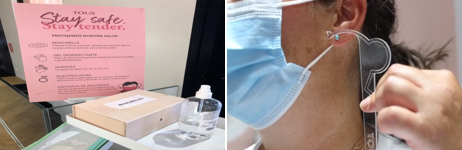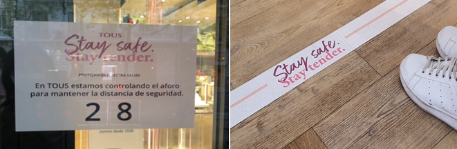 마드리드에 있는 TOUS 매장을 직접 찾아가 보았다. 우선 매장에 들어가기 전 입구에 수용 인원을 통제하는 문구가 큼지막하게 보인다. 매장 안으로 들어가면 팻말에 TOUS가 준수하고 있는 안전 수칙을 적은 팻말이 있고 소독 젤, 장갑, 일회용 마스크를 제공한다. 매장 내 손님들 사이의 안전 거리를 두도록 바닥 곳곳에는 최소 거리 유지를 명시하는 테이프를 붙여놓았다. 점원에게 이 외에 어떤 조치가 추가적으로 있는지 물어보니 모든 직원은 매일 체온 측정, 개별 보호 장비 사용이 의무라고 대답했다.