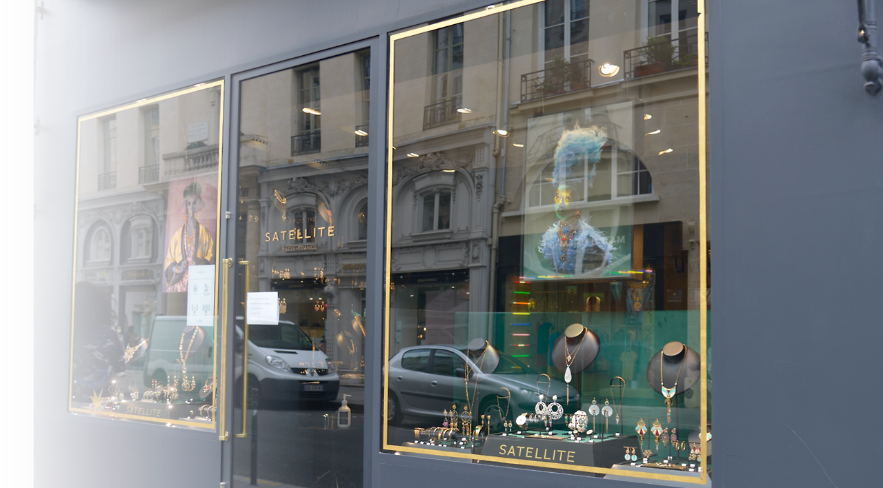 SATELLITE 는 1986년 민족학자 Sandrine과 포토그래퍼 Ouaki 커플에 의해 만들어졌다. 이 커플은 젊어서 새로운 사람, 새로운 것들을 찾아 미국, 아시아, 남유럽 등 전 세계를 여행했다. 주얼리 디자이너 어머니와 원시예술 콜렉터 아버지 밑에서 자란 Sandrine은 여행 중 자연스럽게 고대 보석, 고귀한 재료, 고급 보석, 호기심을 이끄는 물건들을 수집했다. 그녀는 일생일대의 여행에서 돌아오자 직접 주얼리를 만들고자 하는 욕구를 참을 수 없었고, 그의 남편의 격려와 함께 SATELLITE를 시작했다.