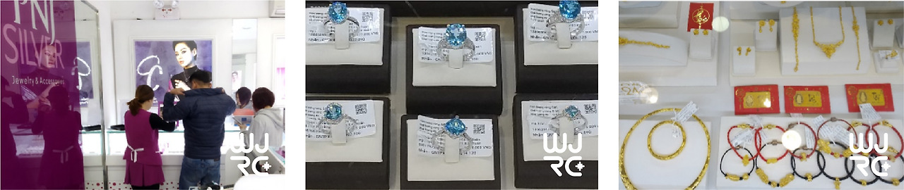 일반 PNJ 매장에서는 확실히 PNJ Silver와는 다르게 가격이 높아지더라도 퀄리티와 이미지에 신경을 쓰고 있는 것을 확인할 수 있었다. 1층에는 루비, 토파즈, 시트린 등의 스톤을 베이스로 한 금 소재 주얼리 피스들이 가장 먼저 눈에 들어왔다. 그 옆으로는 붉은색과 황금색을 주 색깔로 하는 전통적인 베트남 주얼리 피스들이 진열되어 있었다. 2층은 다이아몬드를 베이스로 하는 주얼리를 위한 층으로, 스톤은 스와로브스키(Swarovski) 제품을 사용한 피스들이 있었고, 이탈리아에서 만들어진 주얼리 라인도 있었다.