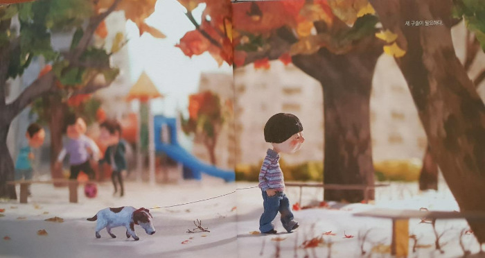 그림책 속 주인공, 동동이는 늘 혼자다. 친구들이 자기들끼리만 논다며 혼자서 구슬치기를 한다. '혼자 노는 것도 나쁘지 않다.'며 스스로를 위로하지만 얼굴 표정은 안타까울 만큼 시무룩하고 슬퍼 보인다. 강아지 구슬이와 늘 함께 다니지만 같이 놀지는 않는다. 목줄에 매인 구슬이는 축 쳐진 몸으로 동동이 손에 끌려 다닐 뿐이다. 놀이터 저 쪽에서 축구공을 가지고 노는 아이들 모습이 흐릿하다. 동동이와 연결되지 못한 세계를 작가는 흔들린 사진처럼 흐릿하게 그려놓고 있다.