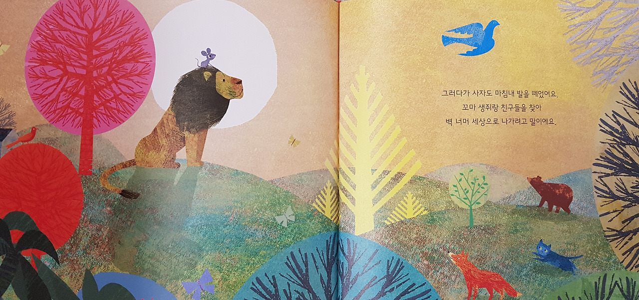 꼬마 생쥐가 벽 너머 세상에 대해 친구들에게 말해 주겠다며 돌아보았을 때, 늘 거기 있던 벽이 사라졌다. 벽을 찾는 생쥐에게 파랑새는 벽은 처음부터 없었다고 말한다. 꼬마 생쥐는 친구들에게 돌아가 자기가 본 세상을 말해 주고, 친구들은 하나씩 하나씩 벽을 통과해 찬란한 세상을 향해 걸어갔다. 가장 늦게까지 남아있던 사자도 꼬마 생쥐랑 친구들을 찾아 벽 너머 세상을 향해 발을 떼었다.
