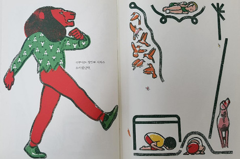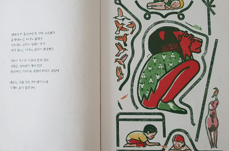 겉표지 한가운데 돋움체의 커다란 제목이 압도적으로 다가온다. 제목 주변 어지러이 날고 있는 새와 웅크린 아이들은 주로 초록과 빨강으로 표현되어 있다. 초록이 안정과 편안함, 휴식의 의미를 지닌다면, 빨강은 불안과 두려움, 경고의 의미를 담고 있다. 작가는 색깔을 통해 한 존재 안에 공존하는 두려움과 안정을 추구하는 마음을 표현하고 있는 것 같다. 겉표지를 넘기면 면지를 가득 채운 빨강이 훅 달려들어 불안과 두려움을 증폭시킨다.