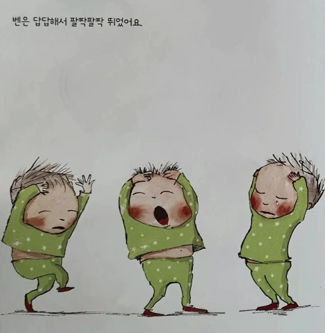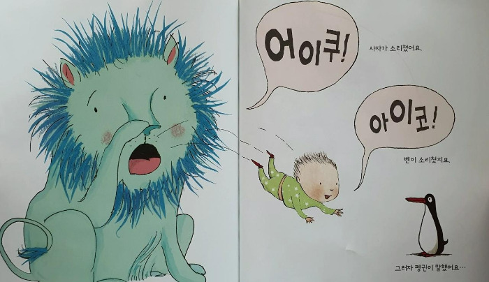 펭귄을 선물로 받는 벤은 함께 놀고 싶어서 펭귄에게 말을 걸고, 웃게 하려고 온갖 행동을 한다. 간지럼을 태우고, 우스운 표정을 짓고, 물구나무를 서지만 펭귄은 웃지 않는다. 배를 콕콕 찌르고, 메롱 약을 올려봐도 소용없다. 묵묵부답 반응이 없는 펭귄을 벤은 지나가던 사자에게 먹으라고 주지만 사자는 먹고 싶어 하지 않는다. 답답해진 벤이 펄쩍펄쩍 뛰다가 “뭐라고 말 좀 해봐!” 소리치자 사자가 시끄럽다며 벤을 꿀꺽 삼켜버린다. 웃지도 않고, 대답도 없던 펭귄이 사자의 코를 아주 세게 꽉 문다. “어이쿠” 사자가 소리치는 바람에 벤이 튀어나온다. 그 순간 펭귄이 벤에게 말을 시작한다. 지금까지 있었던 일들에 대한 자기 생각과 마음을 주저리주저리 ‘그림’으로 토해낸다.