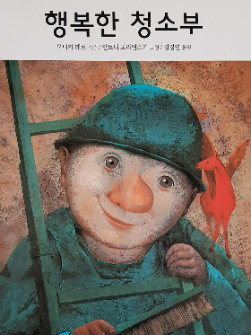 그림책 《행복한 청소부》는 독일 작가 모니카 페트가 글을 쓰고 안토니 보라틴스키가 그림을 그렸다. 대부분 그림책이 글보다 그림으로 더 많은 이야기를 들려주는데 이 책은 글이 중심이다. 겉표지 그림엔 파란 청소복에 파란 모자를 쓴 청소부가 파란 사다리와 파란 솔을 들고 있다. 꿈, 희망, 성장을 상징하는 온통 파랑이다. 생글생글 웃는 동그란 눈에 행복한 미소가 가득하다. 그의 어깨 위엔 날개가 달린 빨간 말 한 마리가 있다. 그리스 신화에 나오는 날개 달린 말 페가수스는 흰색인데 빨간색이라서 그 의미가 궁금해진다. 면지 그림 역시 파란 옷의 청소부가 커다란 책과 첼로 앞에서 행복한 표정으로 서 있다.