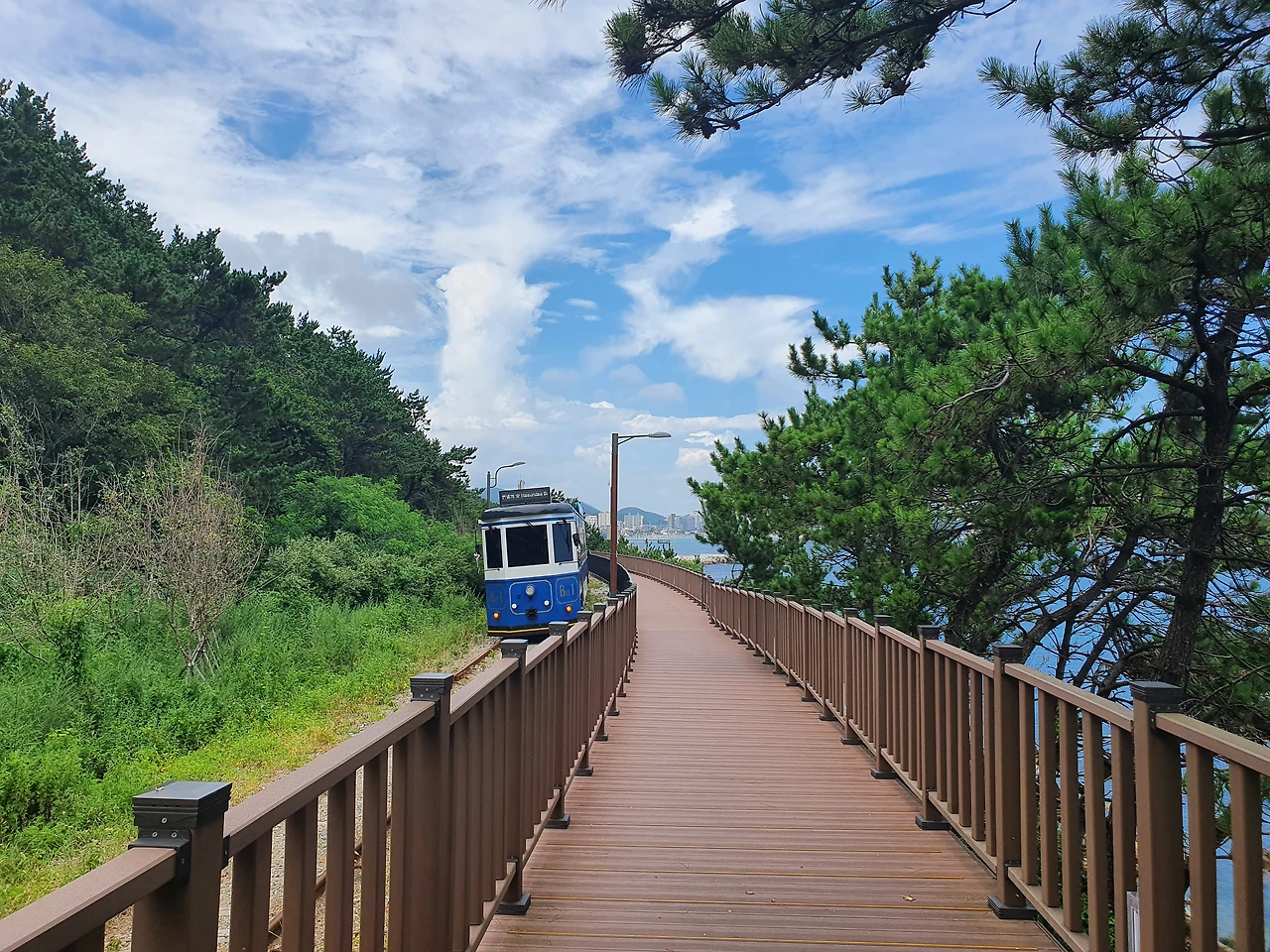 데크 길 왼편엔 해변열차와 스카이 캡슐이 흐르듯 천천히 오가고, 오른편에 확 트인 바다가 아득히 수평선까지 펼쳐졌다. 달맞이재 바다 쪽에 조성된 꽃밭엔 연보랏빛 벌개미취 꽃이 한창이었다. 꽃과 바다가 어우러진 풍경이 풍치를 더해주었다. 푸른 물이 뚝뚝 떨어져 내릴 것 같은 바다 빛깔, 바다 쪽으로 쭉쭉 가지를 뻗은 솔숲, 느리게 지나가는 해변 열차, 온갖 형상의 구름이 떠 있는 하늘… 눈에 들어오는 풍경이 더위를 잊고 계속 걷게 했다. 청사포 정거장 근처 카페에서 시원한 에이드로 더위를 식히고 다시 걷다 보니 다릿돌 전망대가 나왔다. 다릿돌 전망대에서 바라보는 송정해변 풍경과 바다 빛깔이 아름다워 휴대폰 카메라 셔터를 연신 눌러댔다.