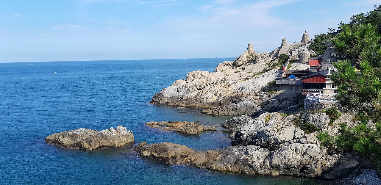 송정해변에서 해동용궁사로 가는 길에 공사 구간을 만나 해파랑길 이정표를 잃어버렸다. 분명 작은 해변 끝자락 소나무 숲에 리본이 있는 것 같았는데, 남편은 그곳엔 길이 없다며 무작정 대로변을 따라 앞서갔다. 대로변 길을 따라가느라 한 시간 이상 더 걸었다. 발이 아파 길옆 나무 그늘에 앉아 쉬다 걷기를 반복하며 겨우 해동용궁사 입구에 도착했다. 절 입구를 알리는 표지석엔 붉은 글씨로 ‘한 가지 소원을 꼭 이루는 해동용궁사’라고 새겨져 있었다. 절에 내려가기 전 카페에서 이가 시릴 만큼 차가운 커피를 마시며 더위를 식히며 아픈 발을 쉬었다.