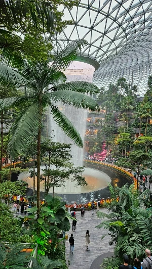 저녁 무렵 우린 호텔에 맡겨 놓았던 짐을 찾아 창이공항으로 향했다. 공항 가는 길에는 올 땐 밤이라서 보지 못했던 아름다운 수형의 가로수를 볼 수 있었다. 비행기 탑승 시각이 자정 이후라서 우린 짐을 보관소에 맡기고 초대형 실내 정원 쥬얼(Jewel) 창이로 갔다. 폭포가 쏟아지는 실내 정원을 둘러보고 쥬얼 라운지에서 휴식을 취하며 탑승 시간을 기다렸다.