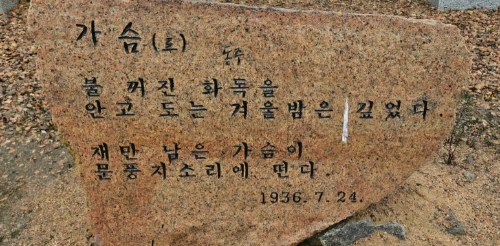 시인의 생가 주변 정원에는 윤동주 시인의 시비들이 줄지어 서 있었다. 시인의 모습을 조각해 놓은 미색의 커다란 바윗돌엔 시인의 대표 시 <서시>가 새겨져 있었다. “죽는 날까지 하늘을 우러러 한 점 부끄럼 없기를 …” 시인의 순결한 정신과 의지가 담긴 <서시>는 읽을 때마다 내 삶을 돌아보게 했었다. 시비들을 둘러보다 시 <가슴 3> 앞에 오래 서 있었다. 2연 4행의 짧은 시에서 춥고 어둡고 아프고 막막했던 시대를 살았던 시인의 마음이 고스란히 전해졌다. 가슴 깊은 곳에서 뜨거운 덩어리가 올라오며 울컥해졌다.