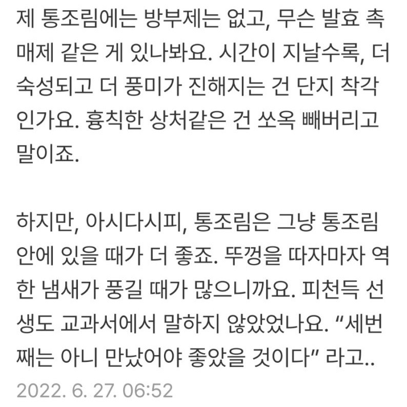 '제 통조림에는 방부제는 없고 무슨 발효 촉매제 같은 게 있나 봐요. 시간이 지날수록 더 숙성되고 풍미가 진해지는 건 단지 착각인가요.'