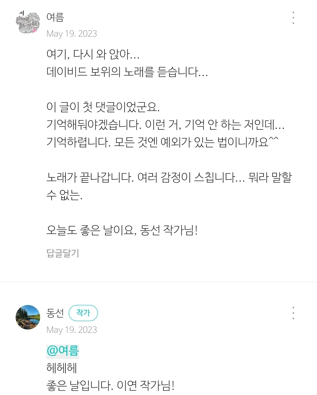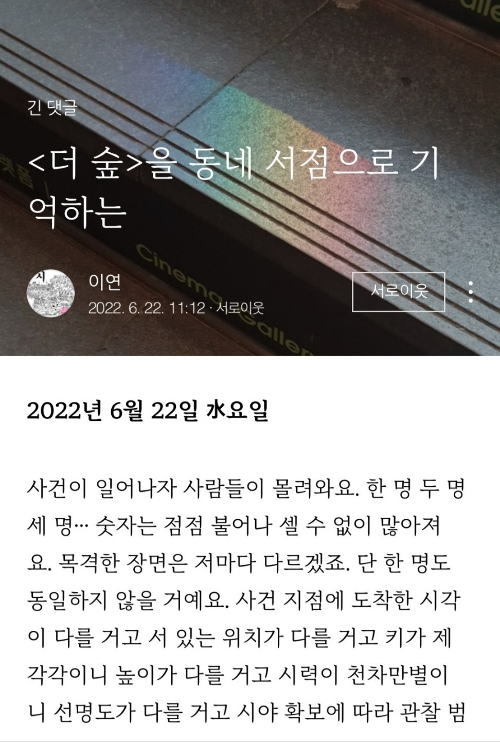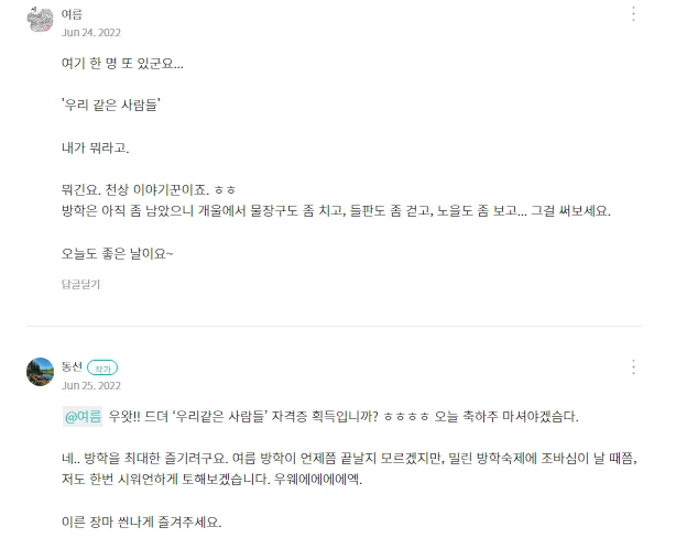일종의 무대 뒷이야기 같은, 영화책 <영화처럼 산다면야> 작업일지 <수다만 떨었을 뿐이데> 공동 매거진. 이 글을 발행하려는데, 어? 작년 오늘 동선 작가님이 제 글에 (블로그) 남긴 댓글이 눈에 들어왔어요.