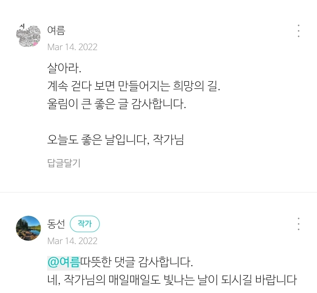 그 문장에 주저앉았어요. … 고만 주저앉고 말았어요. 풀썩. 그 글을 쓰기 전, 그 문장을 토해내기까지 그가 보냈을 시간이 보여서. 그가 걸어왔을 그 길이. 주섬주섬 마음을 일으켜 댓글을 썼어요.