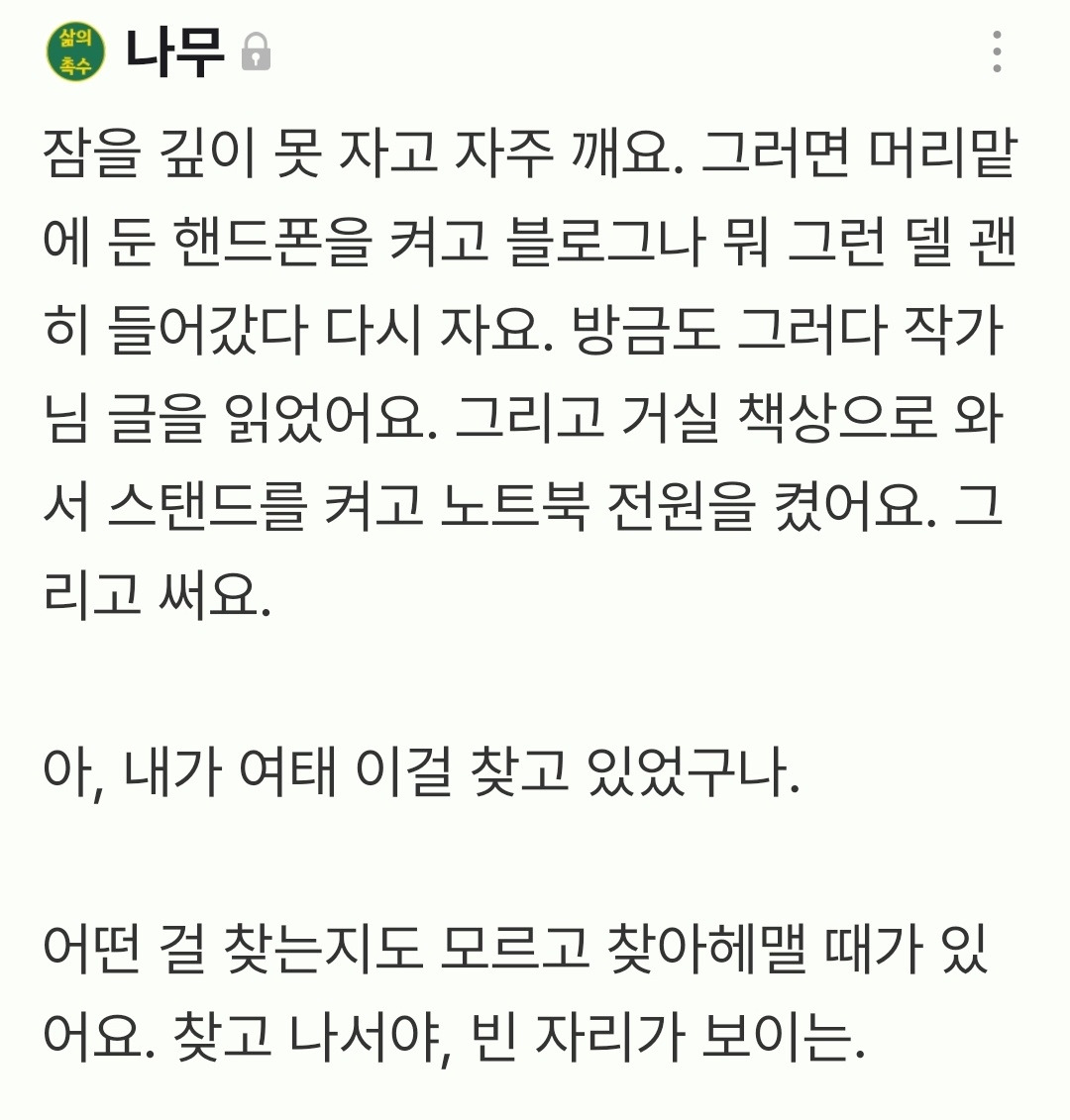 …… 맨날 시뚝빼뚝 삐쳐서 빗장을 걸었다 열었다, 온다 간다 말도 없이 사라지는 저라는 사람. 그걸 다 알고도 내빼지 않은 여기, 당신, 당신들, 고맙고도 고맙고도 또 고마워요. 눈물 나게. 이제 와 고백하면, 도망치려고 했어요. 몇 번이나. 펄럭이는 그 마음 붙드느라 저도, 무진장 애먹었어요. 저한테 그럴 기미가 보일라치면 빗장 문고리 잡고 떡, 버티고 섰던 여기, 당신, 당신들. 다시, 또, 고맙고도 고맙고도 고마워요. 책 내기 전에도, 내고 나서도 맨날맨날 눈물바람. 여기, 당신, 당신들이 건 마법에 홀려서. 그 눈물방울 죄 받아 뵈드리고 싶었어요. 알알이 꿰어 달려가고 싶었다고요. 새벽빛 닮은 푸른 백련이라는 멋진 별명 지어준, 지향 작가님. 잊을 수 없어요. 책도 읽지 않고 모임에 초대하겠다던 수필버거 작가님과의 오랜 인연도요. 매일 들어가서 한 꼭지 한 꼭지 읽던, 절 뭉클하게 한 슬로우스타터 작가님 방, 그 방에서 나던 노오란 참외향이랑 들리던 경춘선 달리는 소리, 사진 속 작가님만의 시선. 잠긴 빗장에 대고 함께, 오래 쓰자고 한 초록 준 작가님. 제 책에 붙여놓은 인덱스 꼬옥 보여주고 싶다던 추앙하는 정연 작가님. 행복 줍줍하면서 저로 하여금 존경 줍줍하게 한 올드플로거 작가님. 제 브런치 웃음 버튼 자작가님. 문디, 라며 애정표현해 주는 능내리 주인장 이강순 작가님. 작가님이 가꾼 꽃처럼 향기로운 글 속에 숨어들어 가만가만 쉬다 가게 해준 라문숙 작가님. 나만 몰랐던 보석 같은 시 읽어주는, 댓글 몇 줄에도 절 알아본 저 먼 데 있는 이진민 작가님. 꼬박꼬박 잊지 않고 발걸음 해주며 선한 미소 닮은 댓글 달아주는 캐리소 작가님. 무조건적으로다가 편파적인 내 편, 이림 작가님. 텔레파시 통하는 사이, 숲속 뜨락 세라 작가님. 생일마다 잊지 않고 맛있는 케이크 보내주는 조승희 작가님. 엊저녁 정말 맛있는 복숭아 있다며 보내주겠다고 떼 쓴 서무아 작가님. 그 분이랑 바라본 어느 밤 달무리, 나눈 문장들과 음악. 금요일마다 그림으로 만나는 소리여행 작가님. 단단한 지지로 묶인 혜나무 작가님과 늘봄 유정작가님. 제 브런치 비밀 사하 작가님. 겹친 이름 나눠가진 김설 작가님. 그리고, 그리고…… 딸랑 A4 한 장 사이에 둔, 내 모든 낮과 밤에 '있는' 오직 사랑하는 내 콩, 폴폴 작가님. 일일이 이름을 다 부를 수 없어 미안한, 인스타에 이렇게 저렇게 홍보해 준 여러 작가님들…. 그리고, 또, 여기선 보이지 않아도, 어딘가엔 분명 있을…… 어느 날의 씀벗이었고, 여전히 그럴, 당신, 당신들. 우리 서로 마음이, 눈빛이 맞닿은 씀벗으로 여기서, 이렇게, 만나려면 얼마나 많은 우연의 겹이 있어야 할까요. …… 있었을까요. 저는… 모르겠어요. 제가 아는 건, 여기, 당신, 당신들과 저한테 걸 마법. 여기서, 당신, 당신들의 씀벗으로, 숨 쉬게 해달라. 하루라도, 더. 한 시간이라도, 더. 1분이라도.