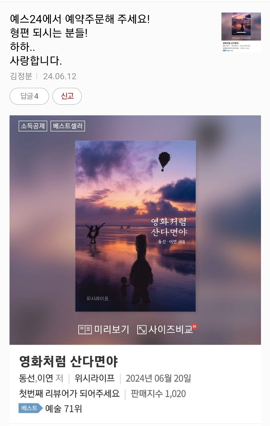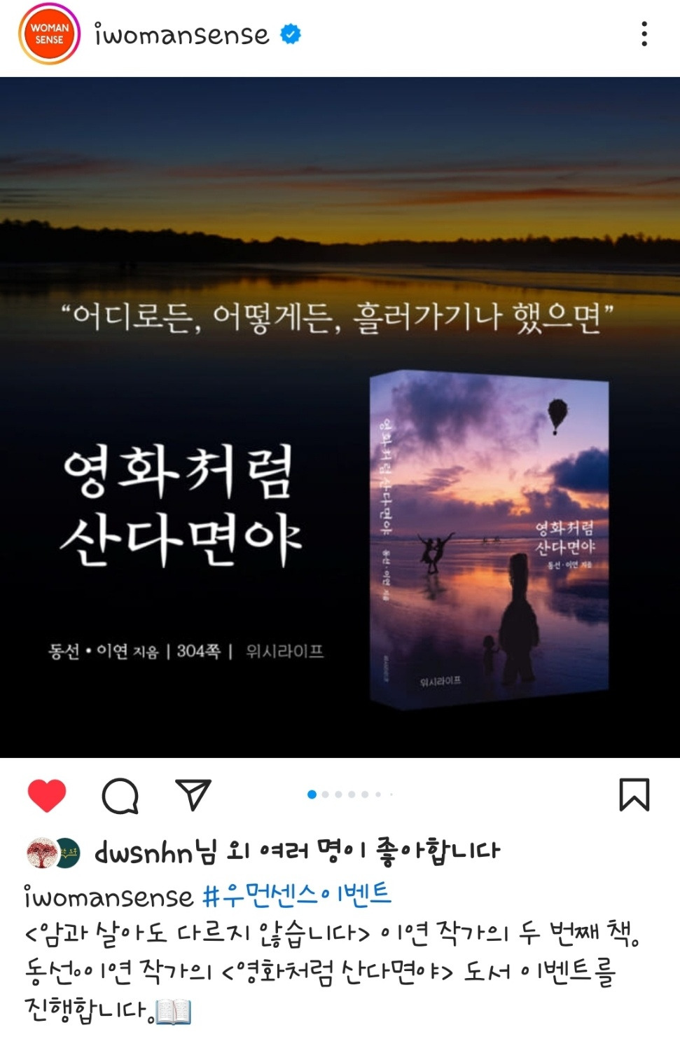 인연을 떠올렸어요. 지난겨울, 광화문 어느 카페에서 그녀를 기다리면서. 그럴 수밖에요. 암 환자가 되고 표준치료도 끝나서 뭐라도 해야 하지 않나, 그러는 참에 다들 숨만 쉬라는데, 그러긴 정말 싫었거든요. 매일 숙제하듯 숲에서 노닥거리고 닥치는 대로 책을 읽고 영화를 보고… 그래도 채워지지 않던 어떤 구멍, 구멍들. 그러고 있는데 전화해서 빽, 소리 지르던 후배 녀석. 언닌 글을 써야 해! 그래서 시작한 블로그. 그게 2019년 2월. 그리고 2020년 9월엔가 발 들여놓은 브런치. 그 바로 전, 블로그 안부창에 글을 남긴 블로그 이웃, 카덴자 님. 그녀가 바로 책 <영화처럼 산다면야>를 출간한 출판사 위시라이프 대표. 제 기억으론 암 투병 이야기인데 글이 문학적이다, 뭐 그런 얘길 하지 않았나. 그래서 감사하다고. 첫 책을 다른 출판사에서 출간한 걸 알고는 아쉬움 묻어난 안부를 남긴 그녀. 그러면서 블로그에 쓴 '숲' 이야길 달라고, 공저를 제안하면서. 그래서 쓴 '숲' 이야기는 다 쓰고는 어쩐지 아니다 싶어 덮은. 시간은 흐르고 흐르고 또, 흐르고. 보이지 않아서 몰랐는데, 제 글 곁에 머문 카덴자 님. 항시.