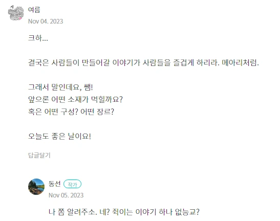 제가 바라는 게 있다면, 드디어 찾은 구멍을 이렇게나 재미나고 신나게 함께 메워준 동선 작가님이 인생 최고의 순간을 맞았으면 하는 거예요. 그 누구보다 빛나게, 우뚝. 그때, 가깝고도 먼 데서 씨익, 입꼬리 올릴 어느 날의 저를 상상하는 것만으로도 뻐근한 가슴께. 왜냐구요? 우린 일만 겁을 돌고 돌아 만난 인연이거든요. 그쵸, 동선 작가님?