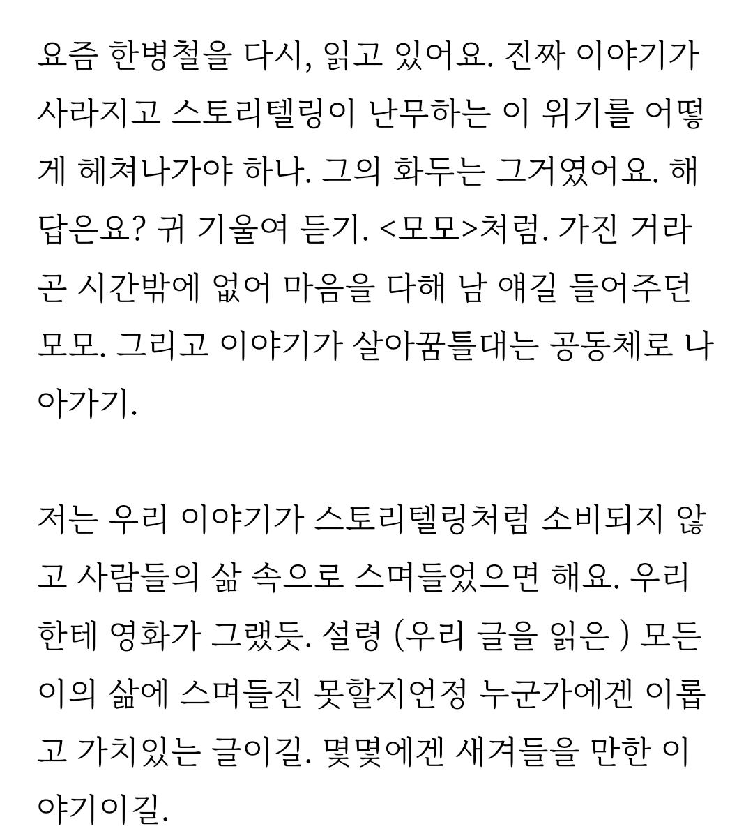 자꾸 영화 쪽으로 기울던 저는 우연히 만난 동선 작가님이랑 원 없이 떠들었어요. 그러고 있고요. 우리 이야길 들은 사람들이 만들어갈 그들만의 이야기를 상상하고 짓고 꿈꾸면서.