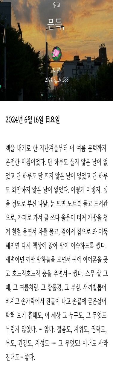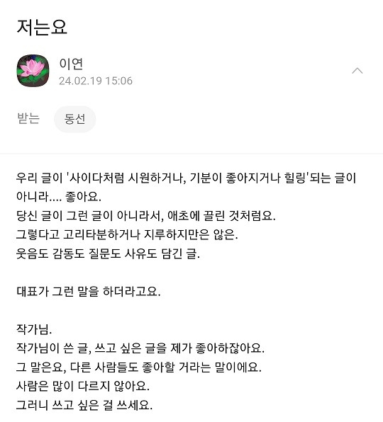 온라인에 쓰긴 해도 아무하고도 소통하지 않고 골방에 틀어박혀 썼어요. 쓰기만. 그러다 글쓰기 플랫폼에 올린 글. 그랬더니 '좋아요'랑 '댓글'이. 전원이 꺼지면 신기루처럼 사라질… 어딘가엔 분명 살과 피, 뼈와 근육으로 있을 존재. 기뻤어요. 읽고 쓰는 두근거림을, 그 전율을 말할 수 있어서. 세상 무용한 짓에 몰두하는 우리를 웃을 수 있어서. 울 수 있어서. (이연, <영화처럼 산다면야> 중에서)