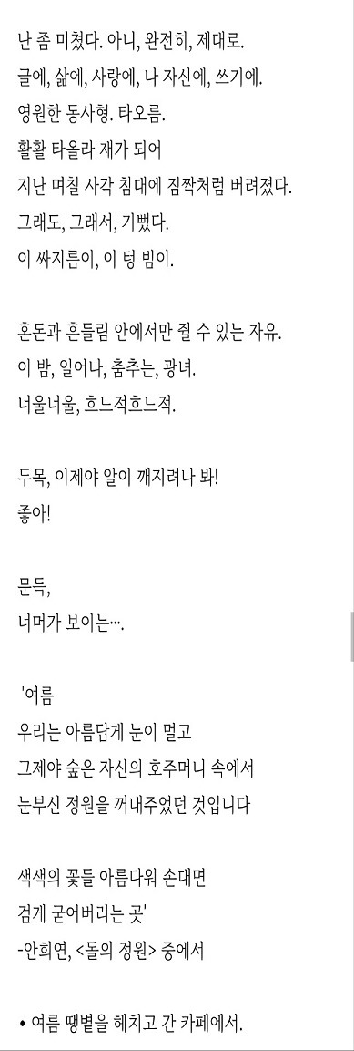 평생 떠받든 마음. 그 낮은 경배. 이젠 좀 다르게 살려고요. 몸의 말에 귀 기울인, 지극한 엎딤으로. 모든 걸 거스른 한 마리 짐승이 된대도. … 될지라도. 읽고 읽고 또 읽어도 질리기는커녕 점점 더 빨려 들어가는 모니카 마론의 소설 <슬픈 짐승> 속 그녀처럼 모든 게 기억날 때까지. 기억난 모든 걸 하나두 흘리지 않고 몽땅 받아 적을 때까지. 여한 없이. 그걸 다 해내고 나면… 잘 거예요. 슬픔의 눈 감겨 주는 잠.*그날은 오래, 아주아주 오래 비가 내렸으면 좋겠어요. 자장가 같은 빗소리가 귓바퀴에 고이게. 눈물이 아닌 빗소리에 온몸이 잠기도록.