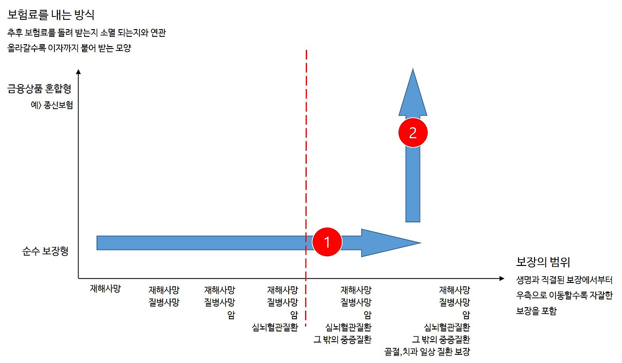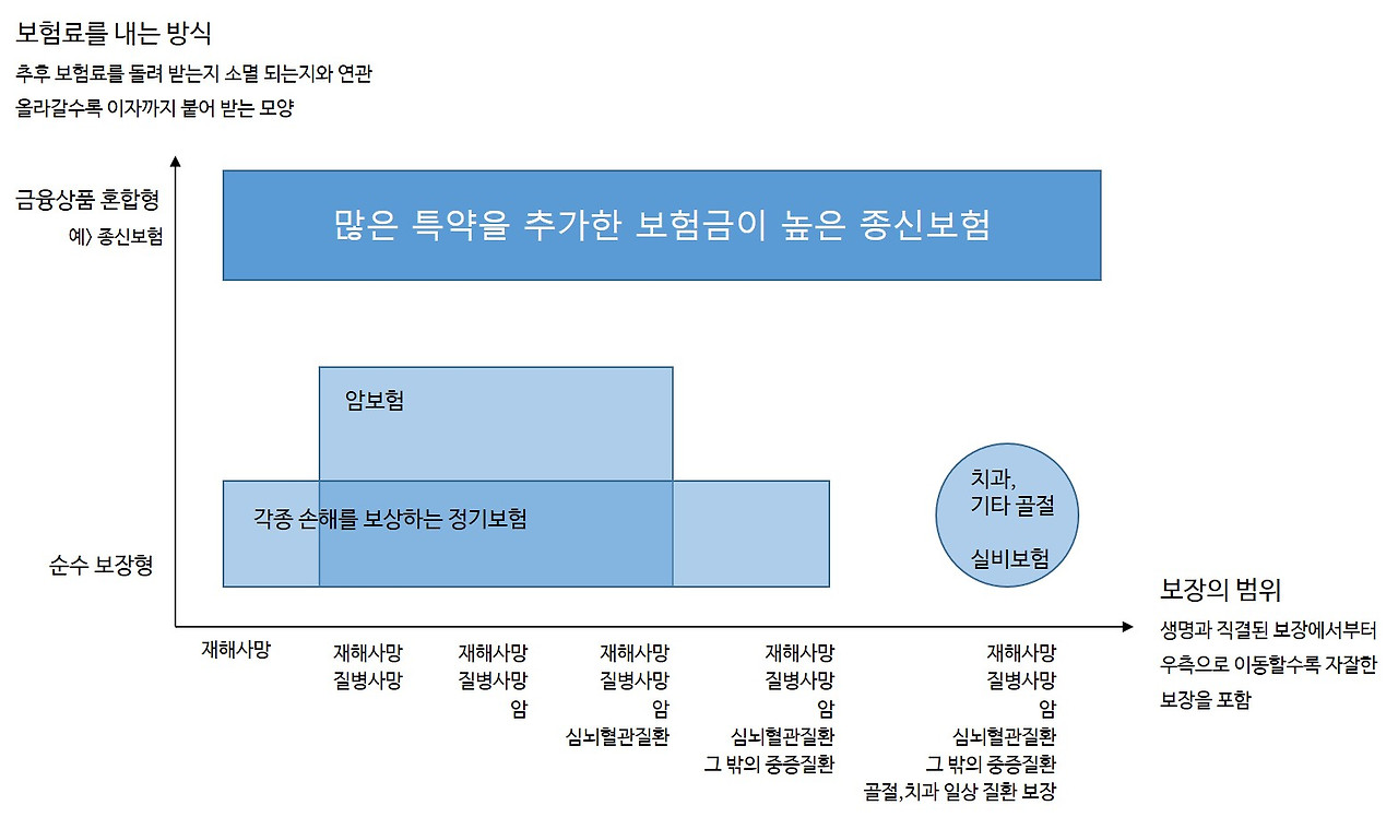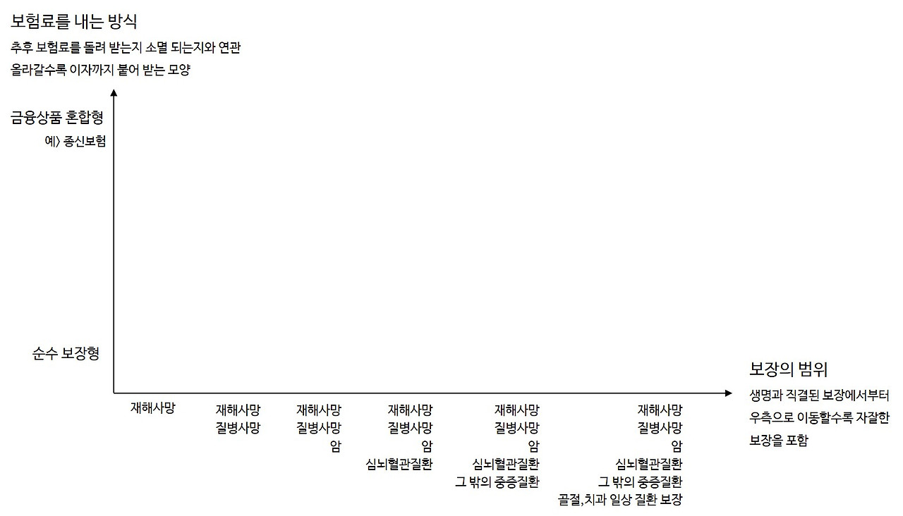 요즘은 보험상품의 경계가 불분명해지고, 특약을 추가함에 따라 결국 모든 보험상품이 비슷해져서 그 영역을 분명하게 나누기가 어렵지만 현행 보험 상품을 그래프 위에 위치시키면 대락 다음과 같다.