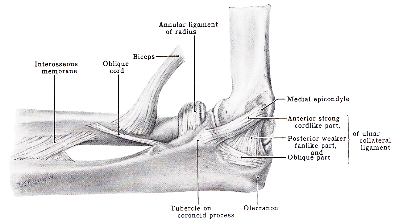 우측의 그림은 팔꿈치의 복잡한 인대구조를 보여주고 있다. 인대가 손상되었을때(과도한 운동이나 사용으로 인하여) 프롤로 치료는 인대의 염증반응을 유도하여 2차적인 회복을 유도합니다.