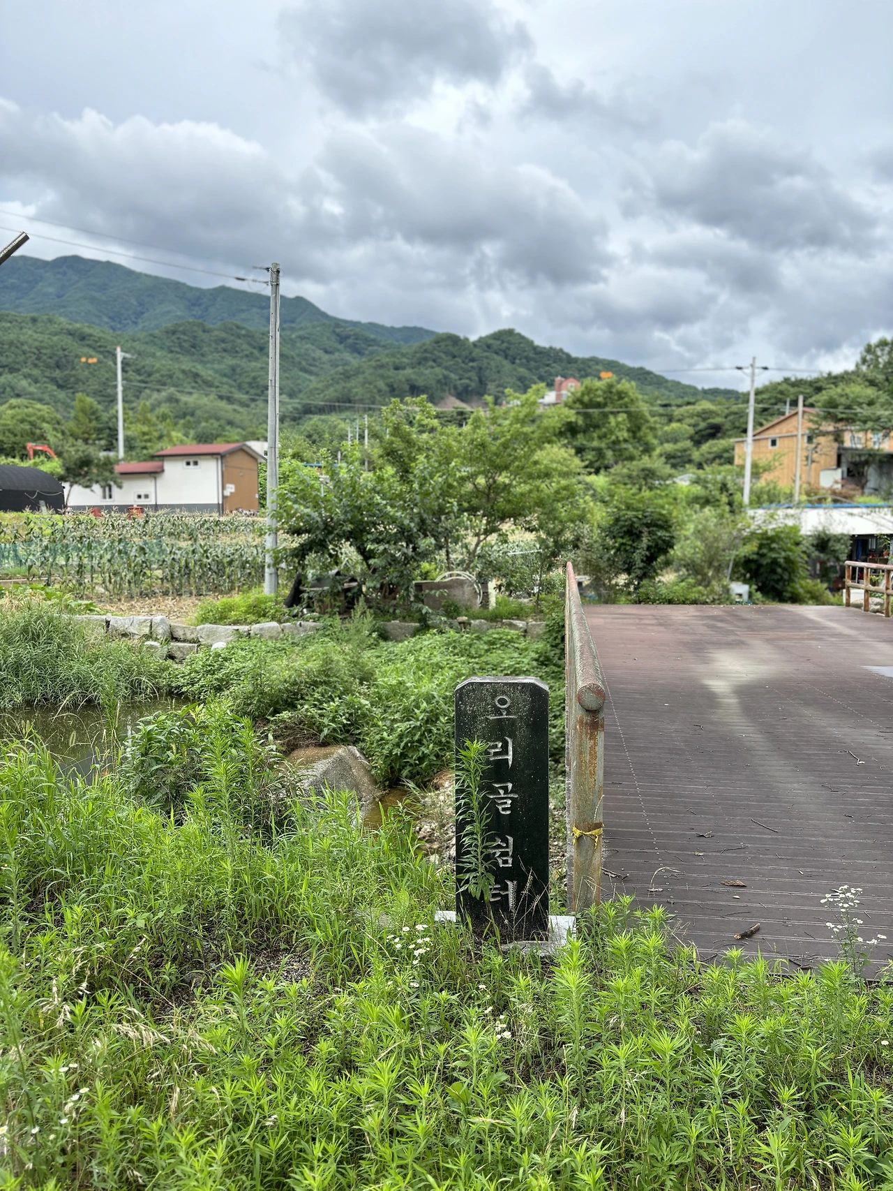 마을 진입로 나가면 버스 다니는 길이 있고, 그 뒤가 언덕배기에 있는 밭이었거든요. 언덕으로 올라가는 좁은 시멘트 길 앞이 정류장인 거예요. 그러면 거기서 상지여중 다니는 애들은 다 만나는 거죠.