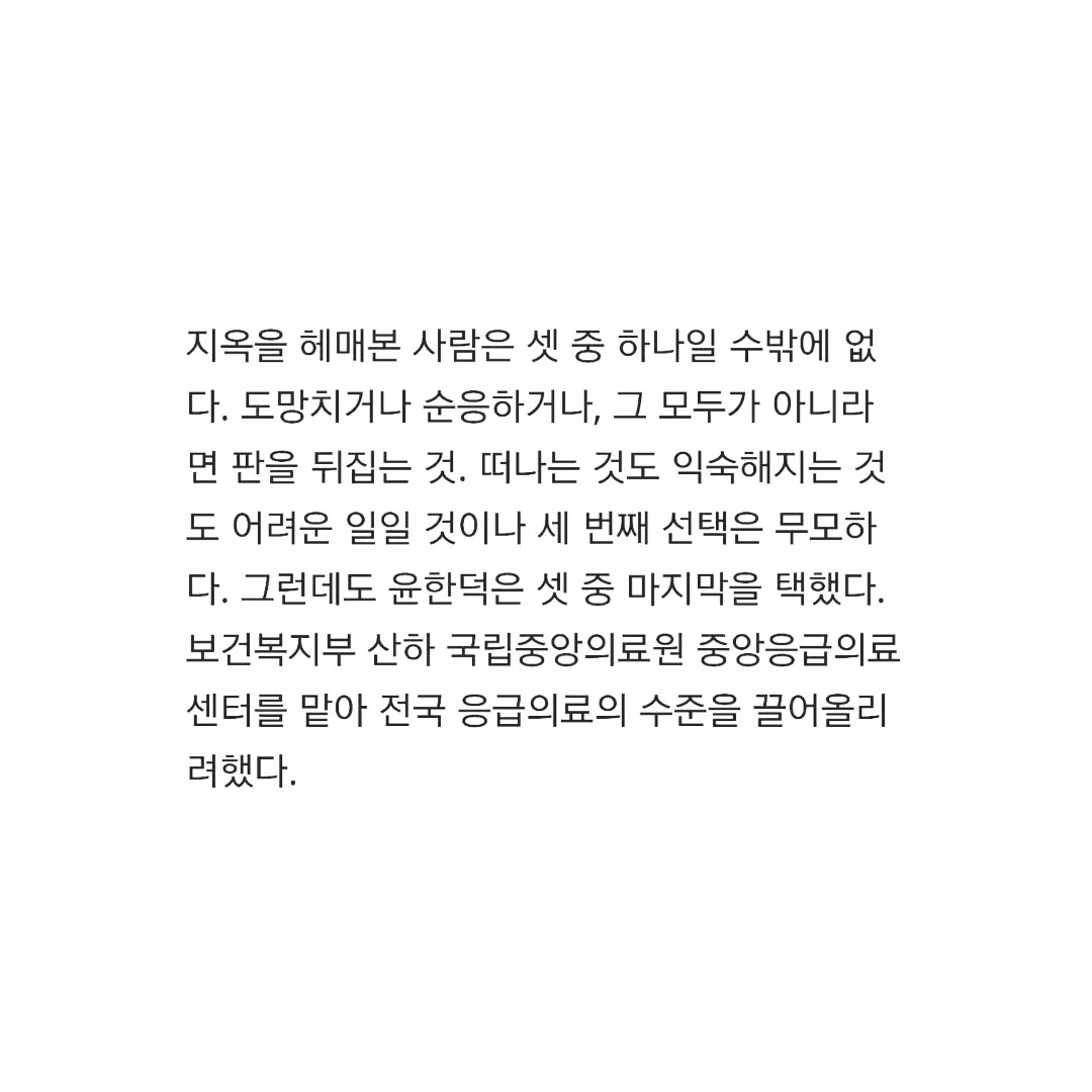 지옥을 헤매본 사람은 셋 중 하나일 수밖에 없다. 도망치거나 순응하거나, 그 모두가 아니라면 판을 뒤집는 것. 떠나는 것도 익숙해지는 것도 어려운 일일 것이나 세 번째 선택은 무모하다. 그런데도 윤한덕은 셋 중 마지막을 택했다.