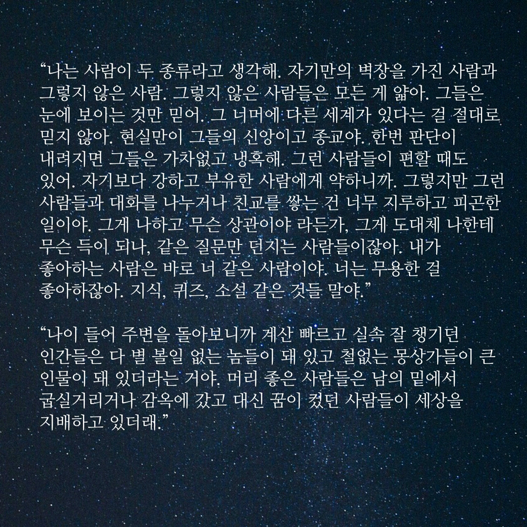 “나는 사람이 두 종류라고 생각해. 자기만의 벽장을 가진 사람과 그렇지 않은 사람. 그렇지 않은 사람들은 모든 게 얇아. 그들은 눈에 보이는 것만 믿어. 그 너머에 다른 세계가 있다는 걸 절대로 믿지 않아. 현실만이 그들의 신앙이고 종교야. 한번 판단이 내려지면 그들은 가차없고 냉혹해. 그런 사람들이 편할 때도 있어. 자기보다 강하고 부유한 사람에게 약하니까. 그렇지만 그런 사람들과 대화를 나누거나 친교를 쌓는 건 너무 지루하고 피곤한 일이야. 그게 나하고 무슨 상관이야 라든가, 그게 도대체 나한테 무슨 득이 되나, 같은 질문만 던지는 사람들이잖아. 내가 좋아하는 사람은 바로 너 같은 사람이야. 너는 무용한 걸 좋아하잖아. 지식, 퀴즈, 소설 같은 것들 말야.”
