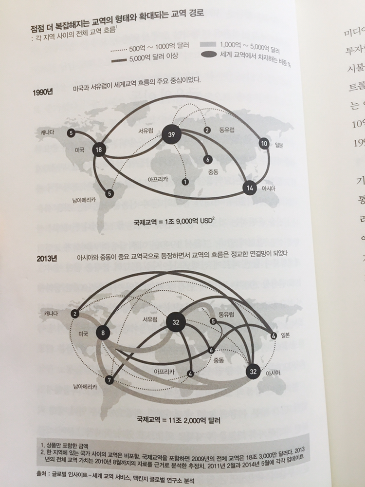 중국만이 아니다. 인도, 인도네시아, 러시아, 브라질 같은 신흥국은 세계의 중요한 제조업 국가가 되었다. 제조업의 부가가치는 1990년 이후 5조 달러에서 10조 달러로 실질 기준으로 2배 증가했다. 그리고 지난 10년 동안 증가한 부가가치 가운데 거대 신흥국이 창출한 부가가치의 비중은 21%에서 39%로 거의 2배 가까이 늘었다. 신흥국과 개도국에 투자하는 외국인 직접투자의 비중도 2007년 34%에서 2010년에는 50%로 그리고 2013년에는 60%로 증가했다. 이런 성장은 단지 전조일 뿐이다. 지금부터 2025년 사이에 신흥국은 선진국보다 75% 더 빠르게 성장할 것이다. 그리고 신흥국 지역에서 연간 소비는 전 세계 소비의 절반에 가까운 30조 달러에 이를 것으로 추정된다. 2025년에 경제활동의 중심지는 서기 1년의 중심지보다 조금 더 북쪽인 중앙 아시아가 될 것으로 보인다. -p36