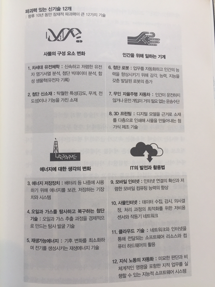 1. 차세대 유전체학 / 2. 첨단 신소재 / 3. 에너지 저장장치 / 4. 오일과 가스를 탐사하고 복구하는 첨단 기술 / 5. 재생가능에너지 / 6. 첨단 로봇 / 7. 무인 자율주행 자동차 / 8. 3D 프린팅 / 9. 모바일 인터넷 / 10. 사물인터넷 / 11. 클라우드 기술 / 12. 지식 노동의 자동화