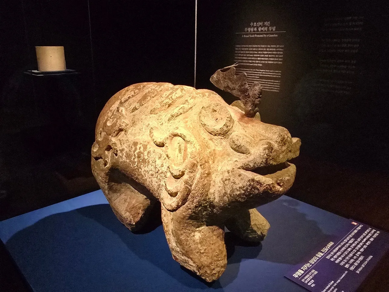 대륙의 진묘수가 기묘하고 섬뜩한 외형을 한 것과 달리, 무령왕릉의 진묘수는 동글동글한 몸뚱어리에 짧은 다리, 뭉툭한 주둥아리가 익살스럽습니다. 파수꾼으로의 위엄은 다소 떨어지지만, 미워할 수 없는 백제의 진묘수입니다.