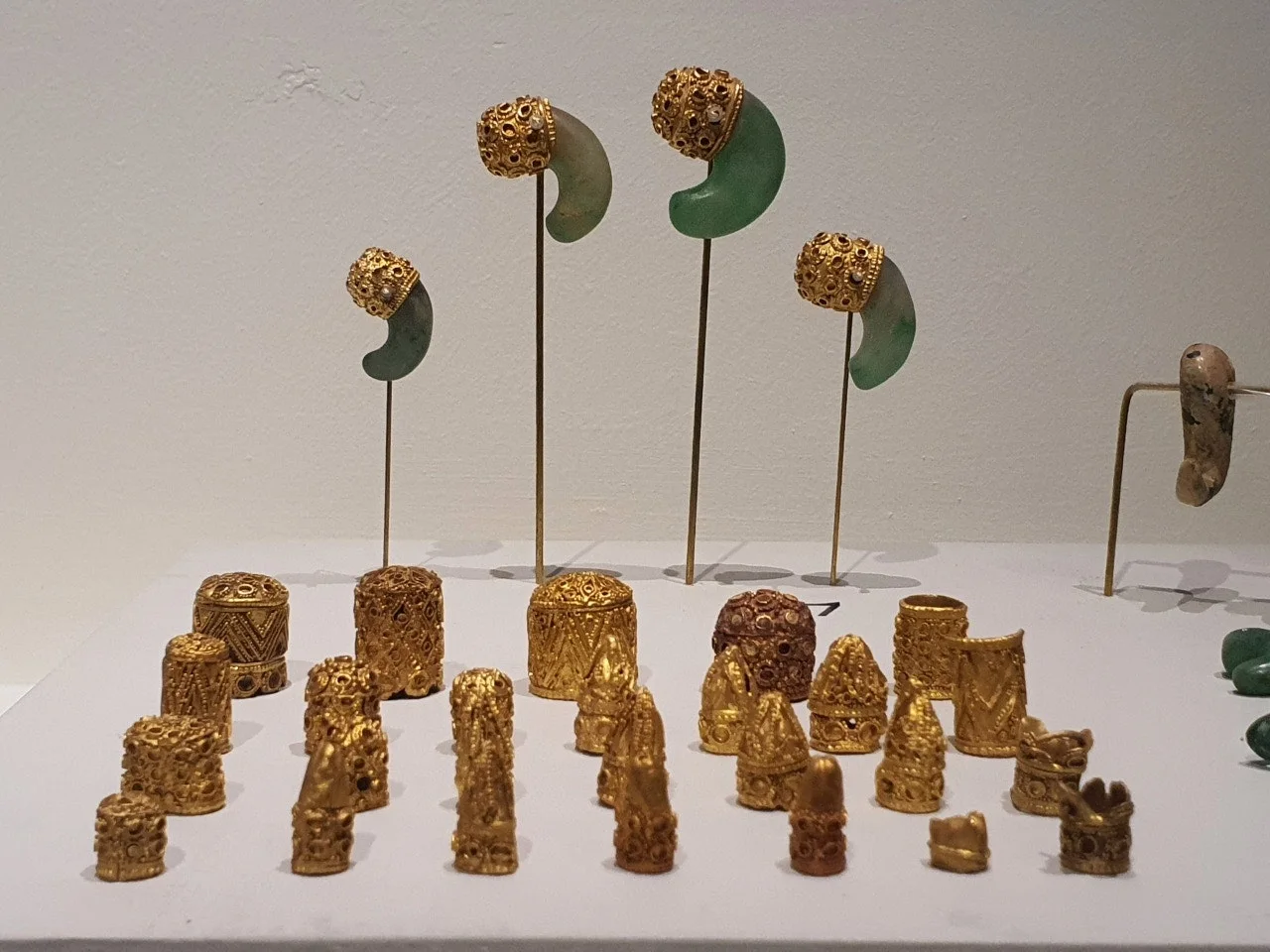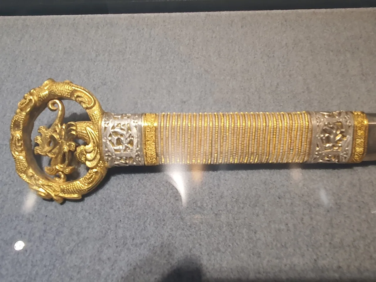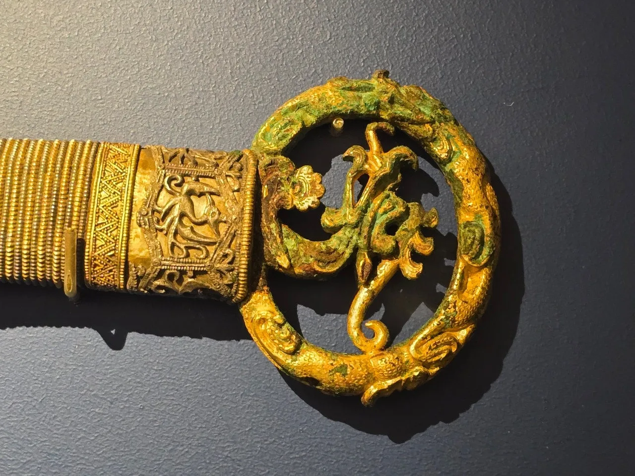 1500년이 지났지만 칼의 손잡이에 있는 금실과 은실은 서로 교차하며 각각의 색을 아직도 형형하게 빛냅니다. 칼자루 끝 고리 부분에는 2마리의 용이 생동감 있게 서로의 몸통을 비틀고 있지요. 고리 아래에는 봉황 하나가 왕실의 부활을 상징하듯 그 날개를 힘껏 펴고 있습니다.