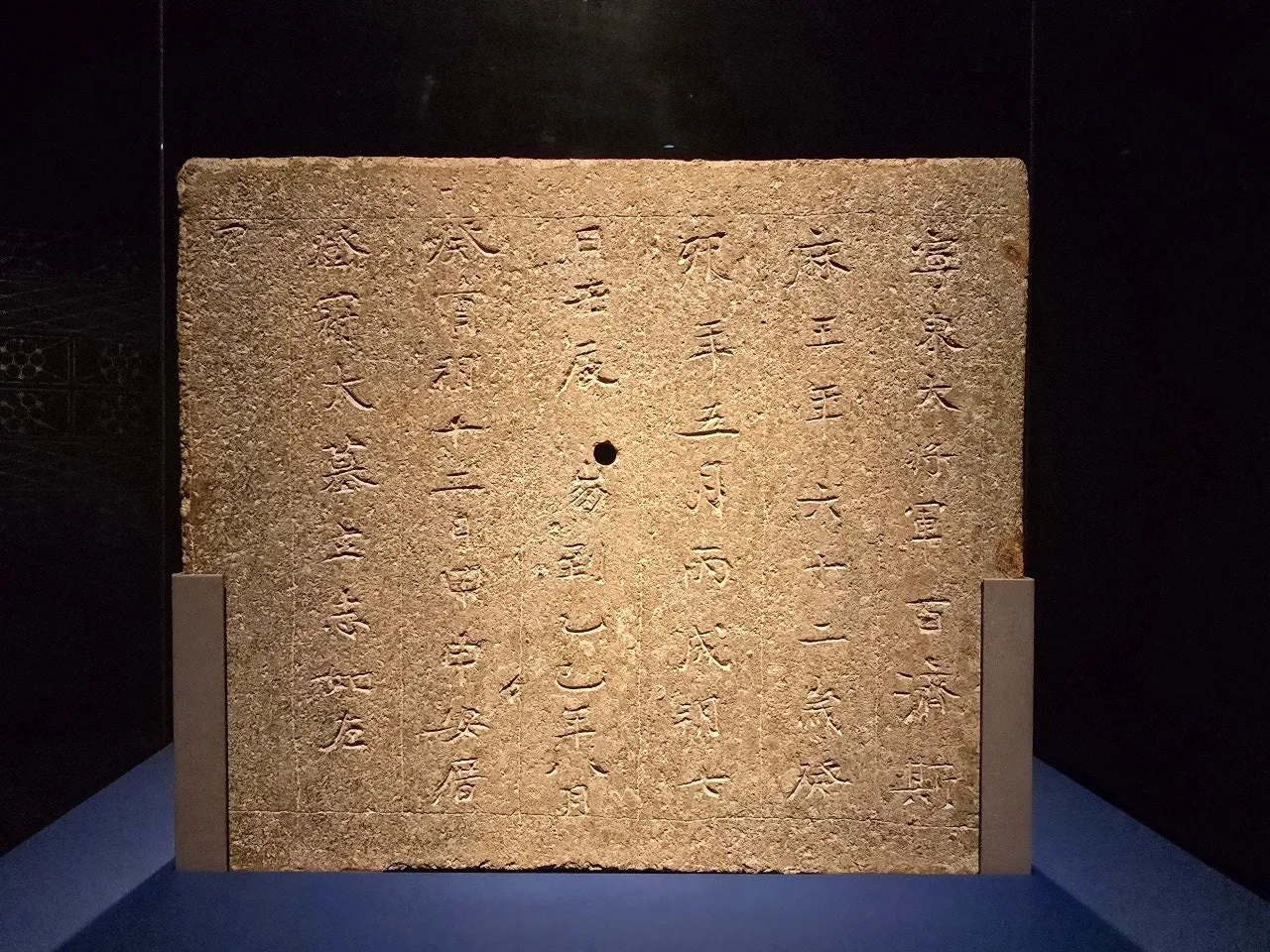 진묘수 뒤편에는 왕과 왕비의 인적사항과 사망 및 매장 시점 등을 기록한 묘지석 2점이 전시돼 있습니다. 무령왕 지석의 첫 구절은 ‘영동대장군’으로 시작됩니다. 어느 때보다 열린 외교를 지향하고, 안으로는 내실을 다져 백제를 다시 강국으로 올려놓은 무령왕의 치세가 압축된 단어입니다.