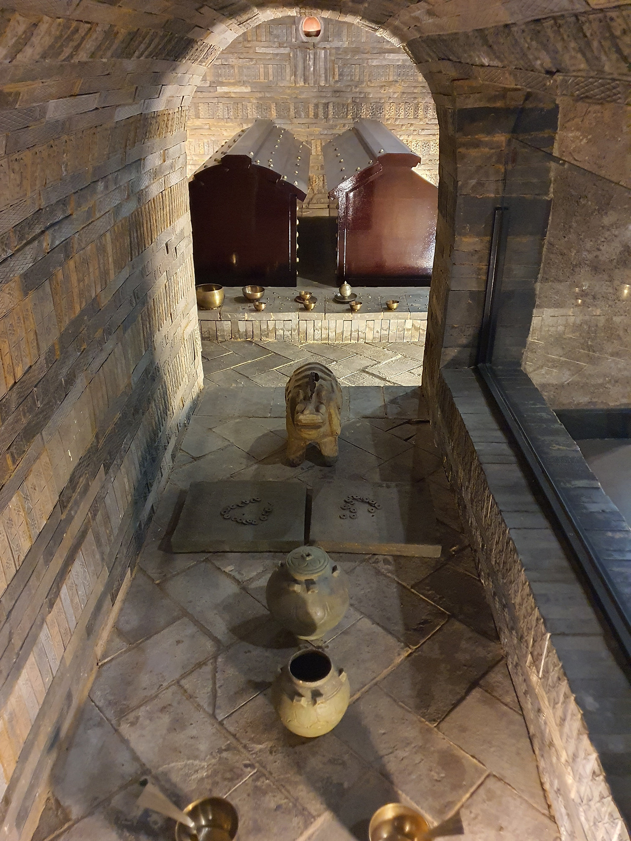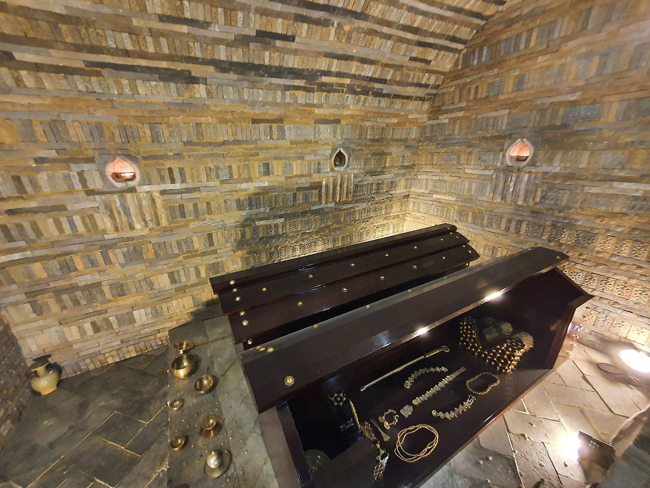 입구가 닫히던 마지막 날, 백제인들은 손수 5곳의 등감과 입구 바닥에 6개의 등촉을 바닥에 둡니다. 등잔이 영원불멸하게 왕릉을 환히 밝히기를 바랐겠지요. 마지막 제사상에는 왕이 생전 좋아했던 은어 3마리가 소박히 오릅니다.