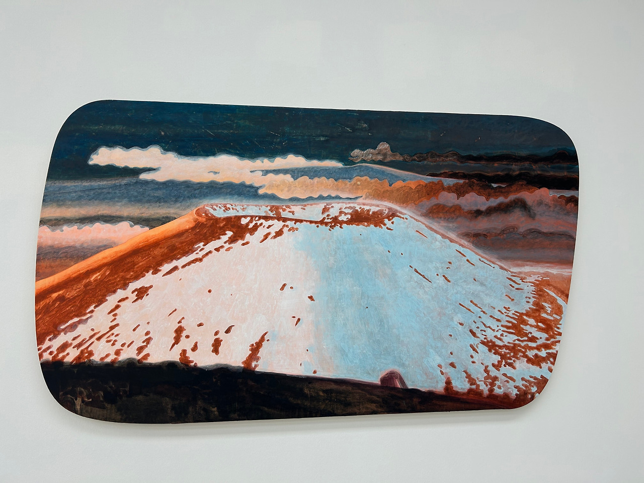이 전시에서 수 유 신이 보여준 작품들은 특정 지명이 작품 제목에 포함된 ‘풍경화’들이다. 전통적인 풍경화와 다른 이 동시대의 회화는 오묘한 색으로 미지의 공간을 그리는 듯하면서도 실제 장소를 기반으로 제작되었다. <연기가 구름이 되어(Smoke becoming cloud #2)>라는 작품 제목에는 ‘화와이, 마우나 케아(Mauna Kea, Hawaii)’라는 지명이 덧붙여 있다. 마우나 케아는 말 그대로 하와이의 흰색 산(kea는 하와이어로 흰색을 의미)이다. 하와이의 더운 날씨에도 불구하고 일 년 내내 하얀 눈으로 뒤덮인 화산이다. 작가는 이 화산을 표현하기 위해 화산에서 채취한 다양한 색상의 화산재를 사용하였고, 역시 직접 수집한 흰색 진주 가루를 갈아 하얗게 보이는 화산의 표면을 나타냈다[그림2]. <일출 회랑(Corridor of sunrise)>이라는 작품 역시 ‘대만, 코끼리 바위(Elephant Trunk Tunnel, Taiwan)’라는 지명이 덧붙여 있다. 이 실재하는 명승지는 작가가 수집한 흙, 광석, 도자기 등을 가루로 만들어 얹힌 작가만의 묘사와 색을 통해 구상과 추상 사이로 재형성되었다[그림3].