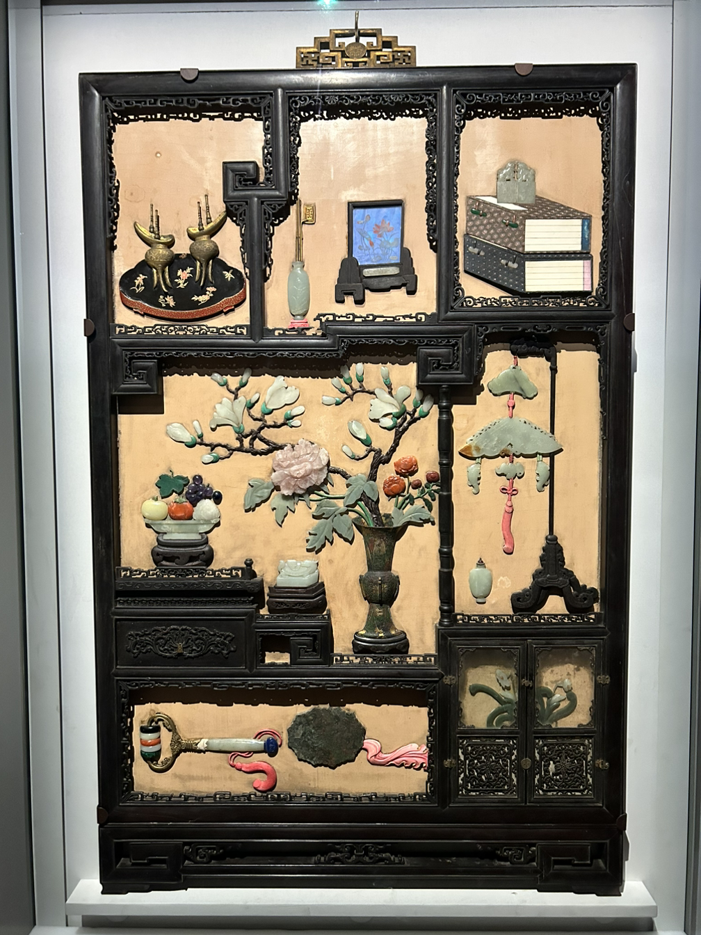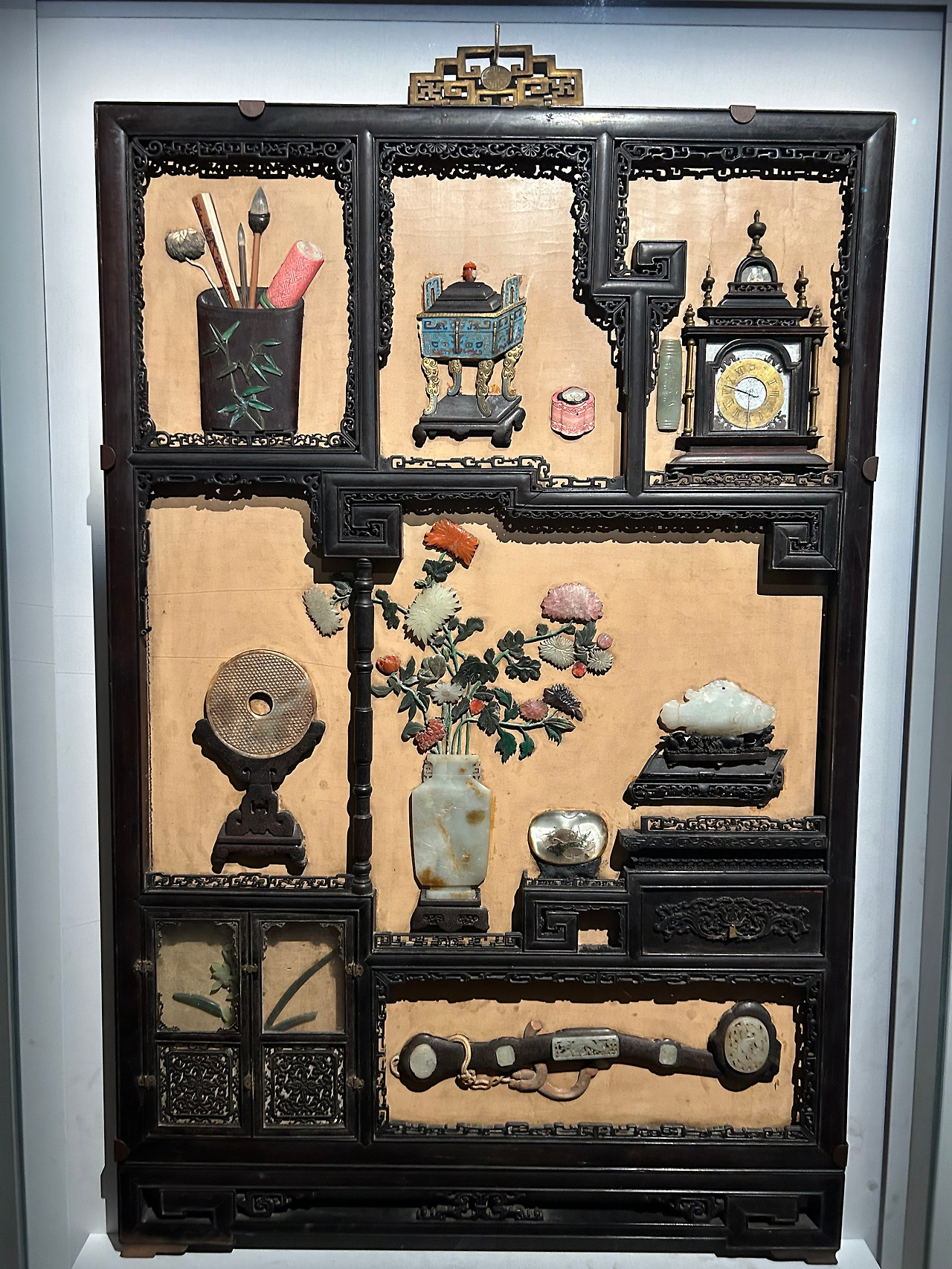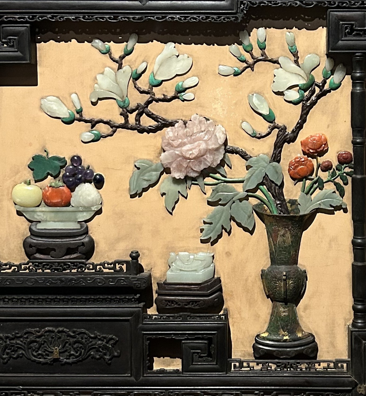 ‘만짐’을 자극하는 이러한 형태는 감상자의 시각뿐만 아니라 촉각을 동시에 자극한다. 기물들은 매화와 모란 등이 피어있는 화분, 골동품, 서책, 옥새, 장식품, 시계, 어항, 물고기 조각, 과일, 문방구 등으로 옥과 보석, 칠보, 자단나무 등으로 만들어졌다[그림3]. 이들은 세밀하게 장식된 나무 선반 사이사이에 배치되어 있는데 이는 청대 궁정에서 소장품을 진열하기 위해 제작하였던 ‘다보격(多寶格)’의 표현으로 보인다.