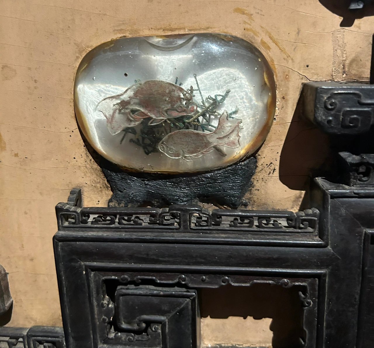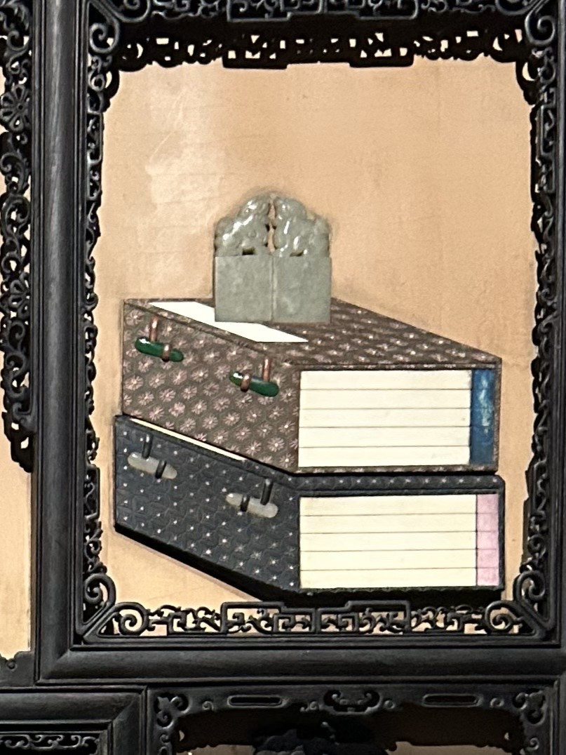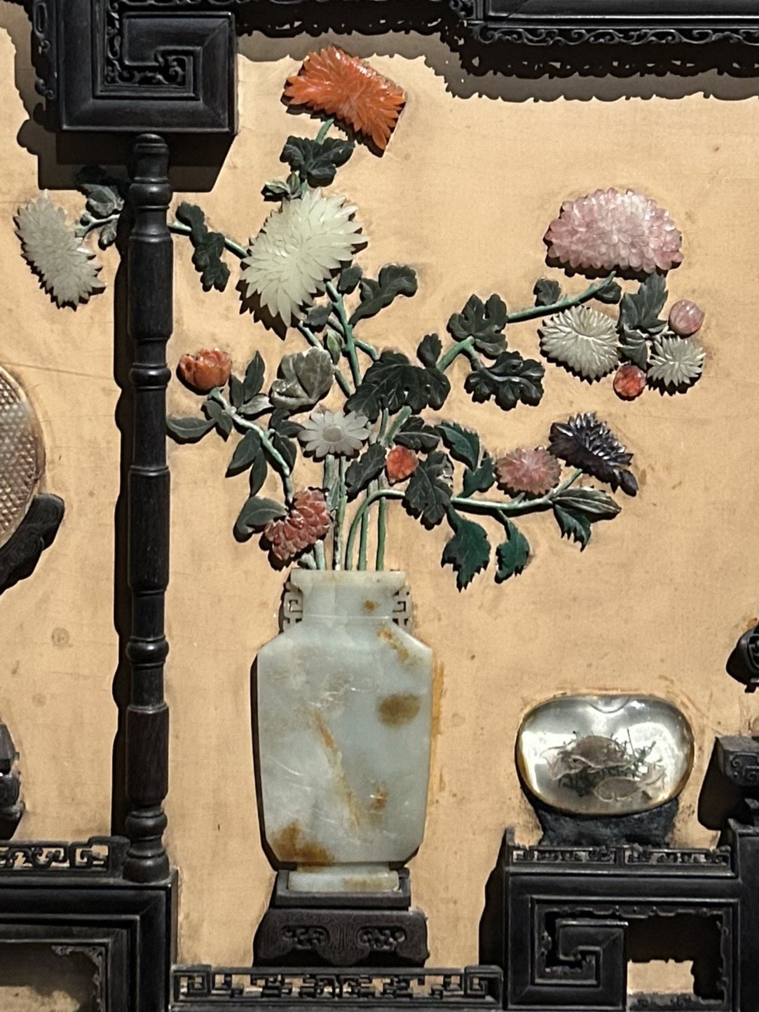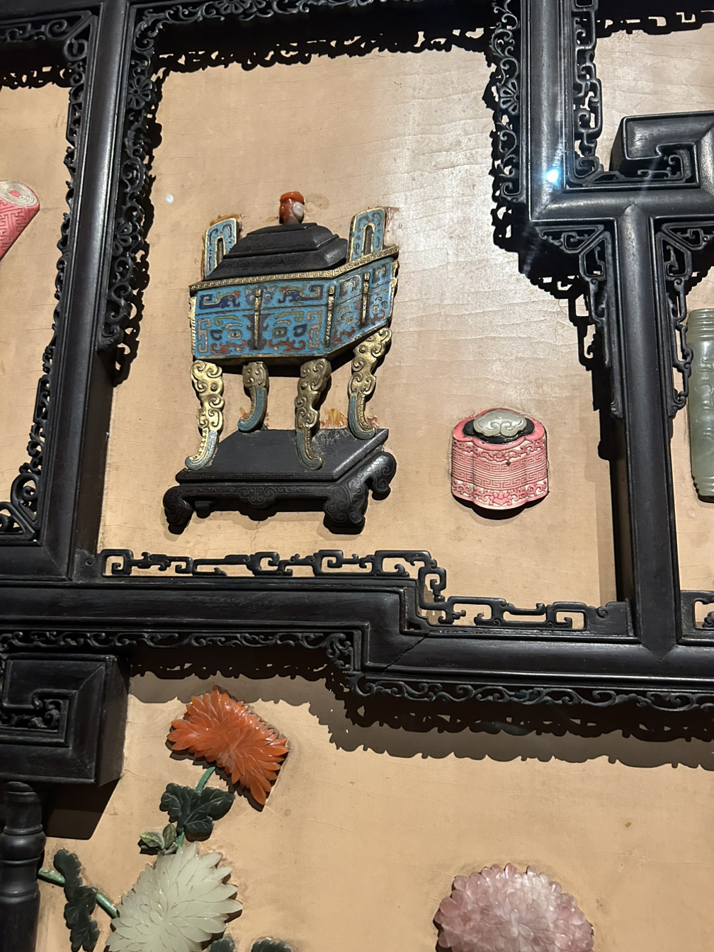 ‘만짐’을 자극하는 이러한 형태는 감상자의 시각뿐만 아니라 촉각을 동시에 자극한다. 기물들은 매화와 모란 등이 피어있는 화분, 골동품, 서책, 옥새, 장식품, 시계, 어항, 물고기 조각, 과일, 문방구 등으로 옥과 보석, 칠보, 자단나무 등으로 만들어졌다[그림3]. 이들은 세밀하게 장식된 나무 선반 사이사이에 배치되어 있는데 이는 청대 궁정에서 소장품을 진열하기 위해 제작하였던 ‘다보격(多寶格)’의 표현으로 보인다.