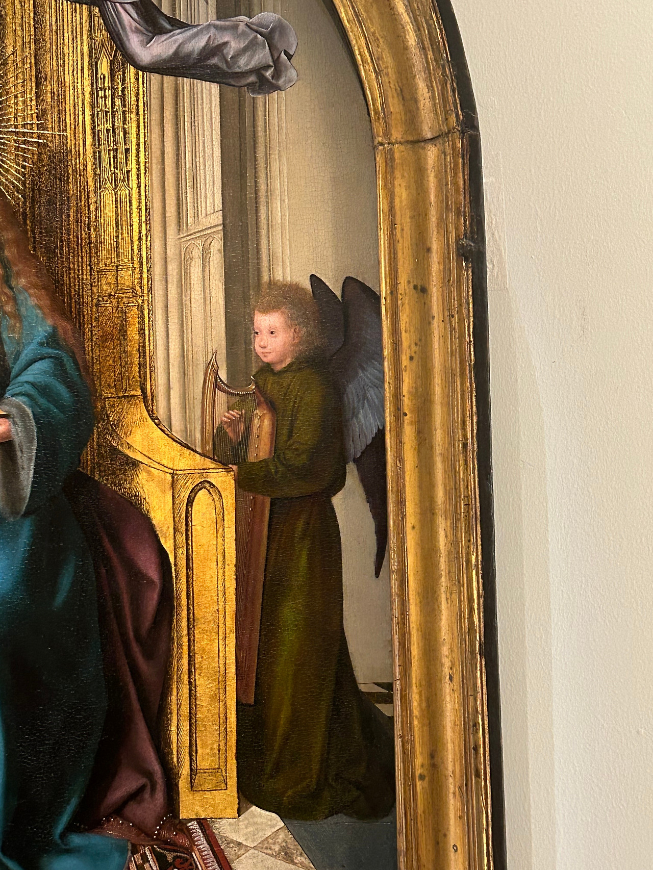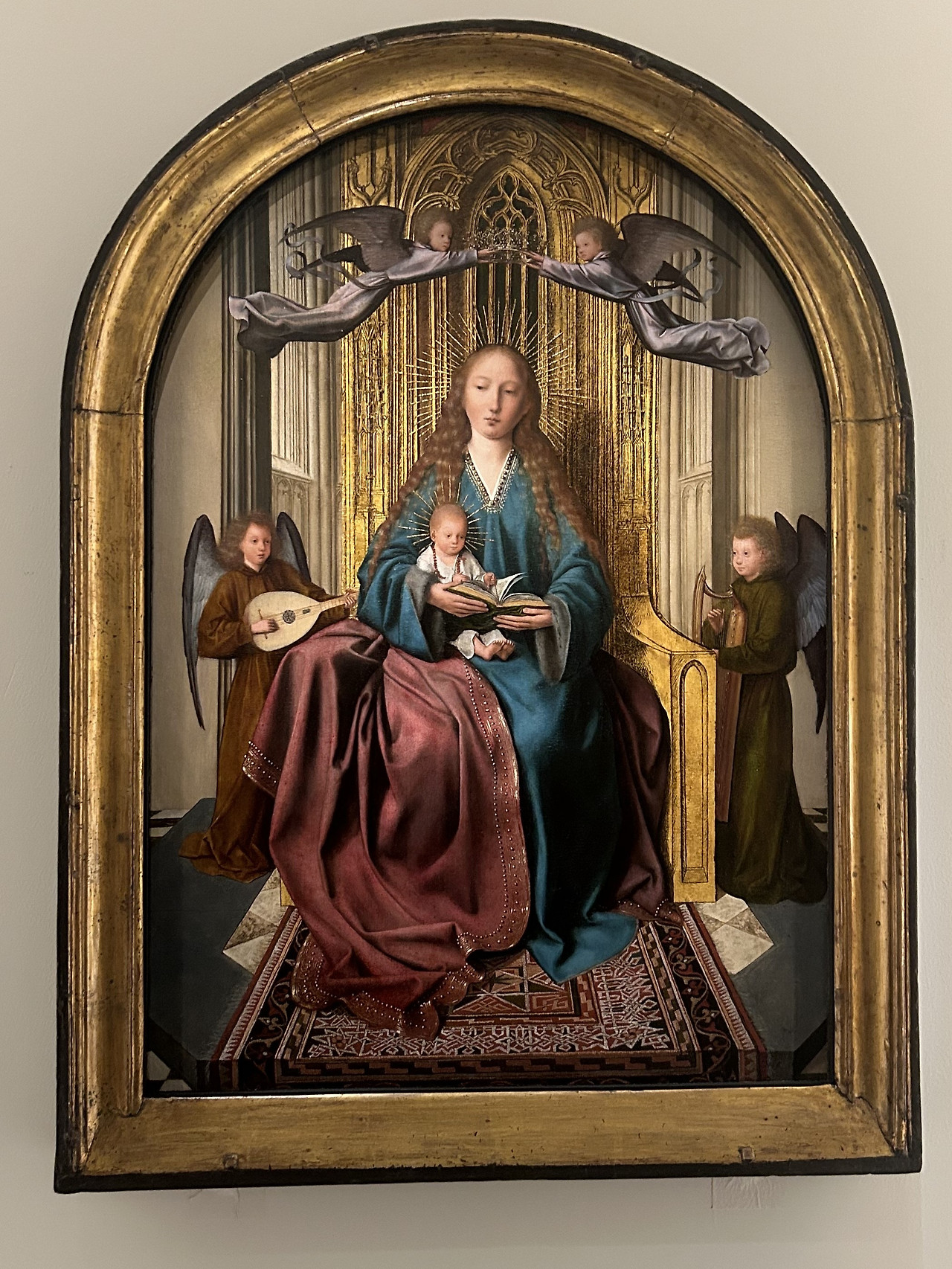 마시스는 <보좌의 앉은 성모자와 네 천사(The Virgin and Child Enthroned, with Four Angels)>에서 아름답고 화려한 세부묘사로 성모자를 천상의 마리아와 위엄 있는 하느님의 아들로 묘사했다. 고딕 양식의 성당에서 신자들의 기도를 그리스도에게 전해주는 교회의 어머니로서의 성모는 금색 왕좌에서 예수를 품고 앉아 있다. 성모의 머리 위 두 천사는 에나멜과 유리로 섬세하게 묘사된 왕관을 씌우려고 옷자락을 펄럭이며 내려오고 있고 양옆에 자리한 두 천사는 각각 류트와 하프를 연주하고 있다. 아기 예수 역시 언젠가 흘릴 피를 상징하는 붉은 산호로 만든 염주를 목에 걸고 성모가 들고 있는 구약의 책갈피를 잡아당기고 있다. 성모의 소매에서 살짝 보이는 회색 모피, 청록색 드레스와 붉은 망토의 금색 자수와 진주 장식, 성모의 옷자락이 닿는 곳에 있는 기하학적 무늬의 이국적인 카펫 등의 치밀하고 꼼꼼한 묘사는 감탄을 불러일으킨다.