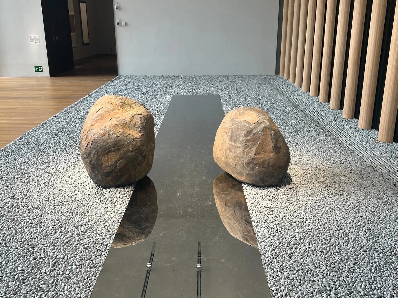 미술관 밖 홍콩 풍경이 내다보이는 넓은 창을 가진 넓은 직사각형의 전시실에 들어서면 돌과 스테인리스 철판으로 설치된 <관계항-거울 길>을 만난다. 넓은 바닥의 절반에는 작은 조약돌들이 펼쳐져 있고 그 위에 사람 한 명이 지나갈 수 있는 폭의 기다란 은빛 스테인리스 강판이 놓여있다. 그리고 두 개의 큰 돌이 이 강판을 사이에 두고 올려져 있다. 강판은 작품의 부제가 말해주는 것처럼 거울처럼 돌과 그 주변을 반사하고 있다[그림1].
