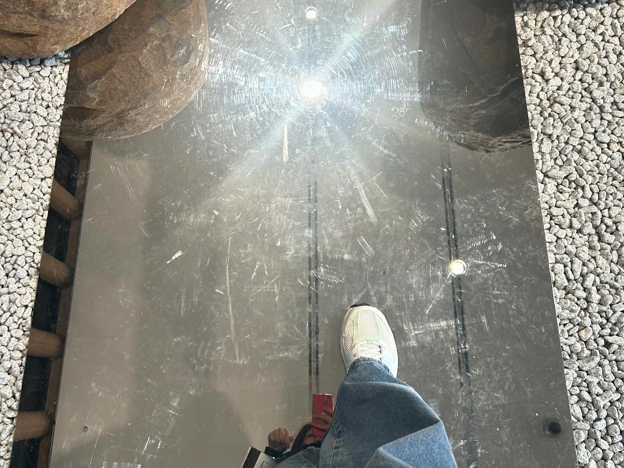처음 작품을 보았을 때는 그 재료와 설치가 매우 단순하다는 느낌을 받는다. 그러나 작품에 서서히 접근하면서 곧 자연에서 온 거친 느낌의 돌과 공장에서 매끈하게 가공된 강판이 묘한 긴장감을 불러일으킨다. 그리고 작품 설명판의 안내에 따라 조약돌을 밟으며 작품에 들어서는 순간, 조약돌과 내 발이 맞부딪힐 때 나는 소리에 집중하게 된다. 몇 발자국 후, 카펫처럼 긴 스테인리스에 올라서면 그 소리는 사라지고 창문을 통과한 햇살과 나와 내 주위를 반사하고 있는 스테인리스에 눈이 부시다. 그리고 다시 돌 사이를 지나 다시 조약돌을 밟고 나오는 과정을 거치면서 이 장소와 나를 조금은 새롭게 인식하게 된다.