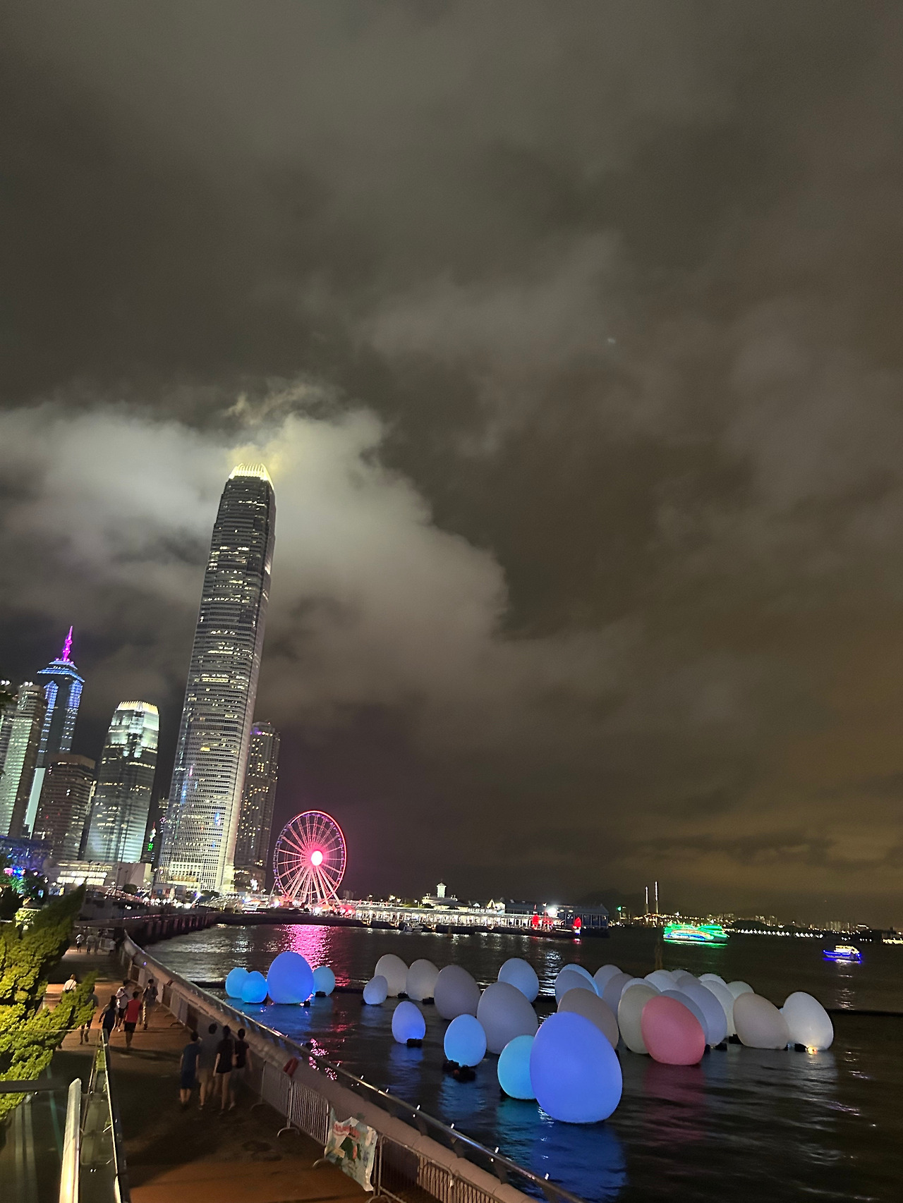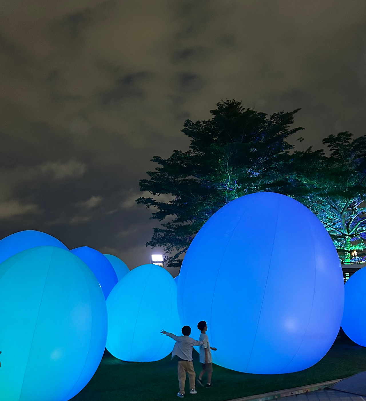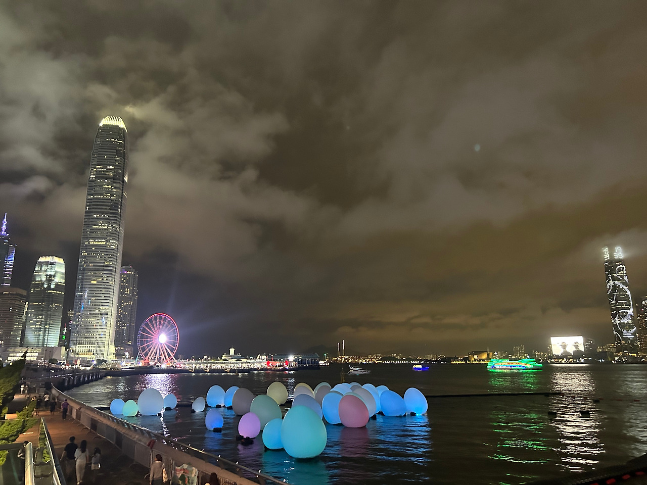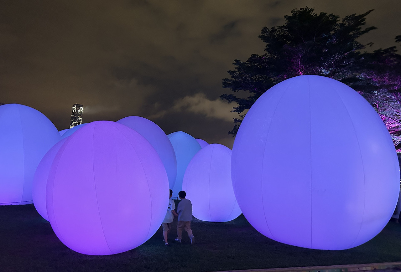 동화에서나 나올 법한 이 광경은 올해 6월 초까지 홍콩의 빌딩 숲과 빅토리아 하버 사이에 있는 타마르 공원의 잔디밭을 방문한 사람들이 느꼈던 경험이다. 위에서 나비 알이라고 쓴 것은 팀랩(teamLab)이라는 아트 컬렉티브(art collective)가 기획하여 홍콩에 설치한 타원형의 설치물이다[그림1]. 이것들은 <teamLab: Continuous>라는 제목 아래 빅토리아 항과 공원 등지에 무수히 설치되어 파도와 바람, 그리고 사람들의 손길에 밀렸다 일어나기를 반복했다[그림2].