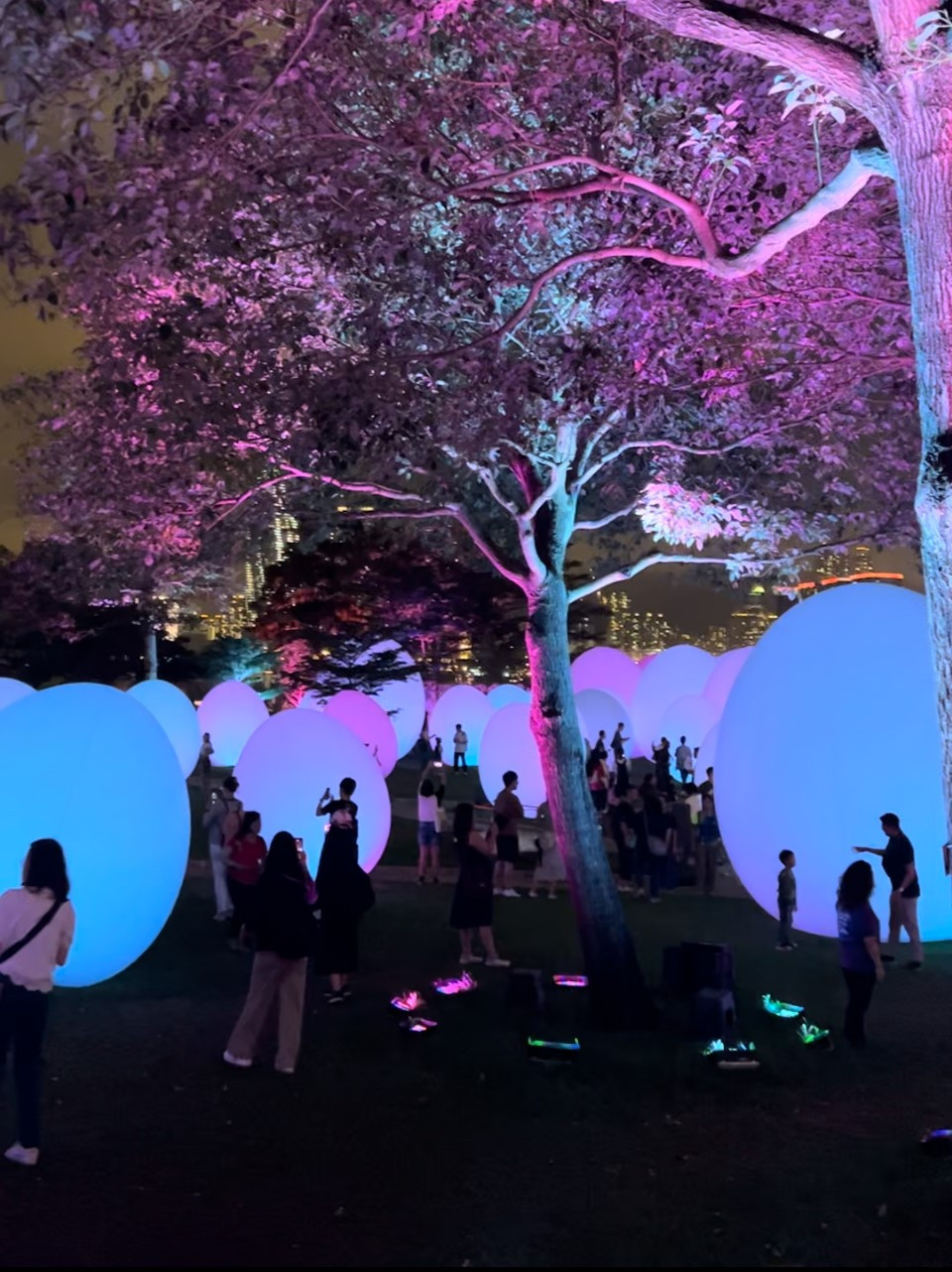 반면, 홍콩에서의 <teamLab: Continuous>는 실내 전시장이 아닌 탁 트인 빅토리아 항구와 침사추이의 스카이라인을 전망으로 아름다운 장관을 이루었다. 이 타원형의 설치물은 파도, 바람, 사람에게 밀리면 스스로 다시 일어나며 밝게 빛나고 소리를 내고, 이 빛과 소리는 근처의 타원형과 나무 사이로 공명한다. 내가 타원형의 푹신푹신한 설치물을 밀면 설치물은 빛과 소리의 공명을 근처의 다른 타원형, 그리고 나무와 사람에게 전달한다. 그러나 바람도 없고 주변과 상호작용하지 않을 때는 빛이 천천히 깜빡이도록 설계되었다. 따라서 근처에서 은은한 빛이 느껴진다면 이는 거기에 사람이나 바람 혹은 파도가 존재한다는 것을 의미한다.